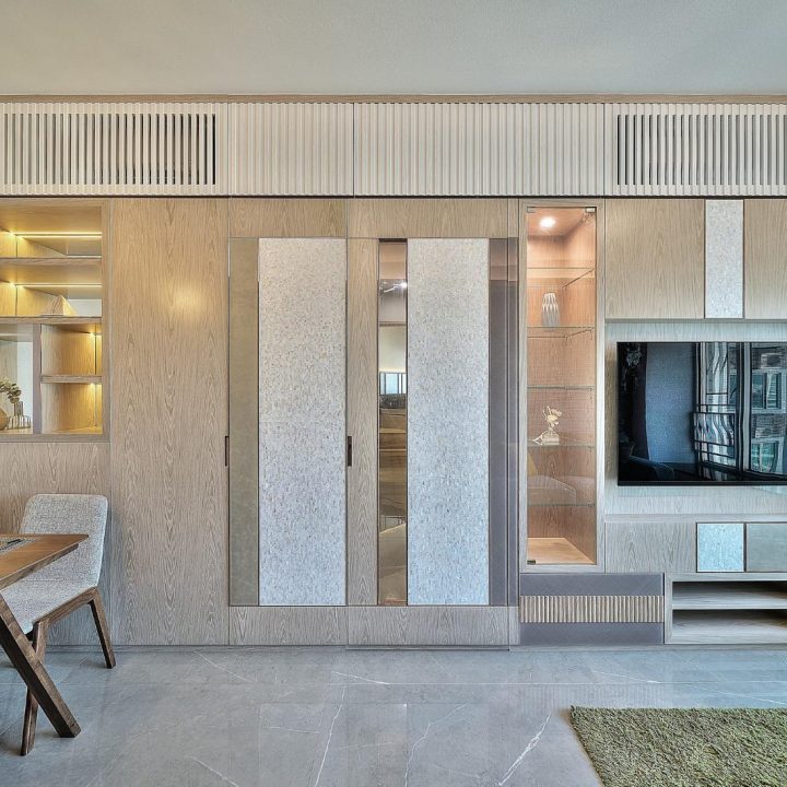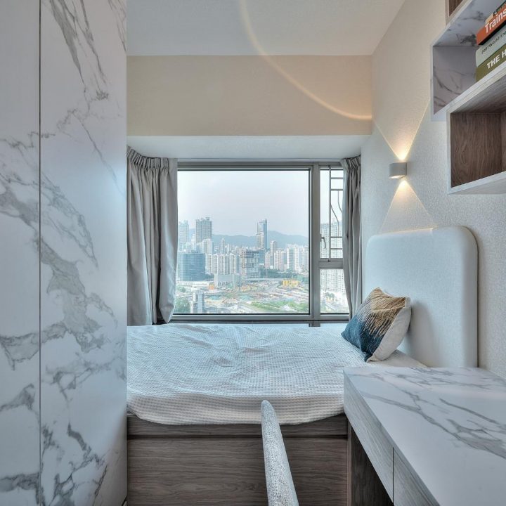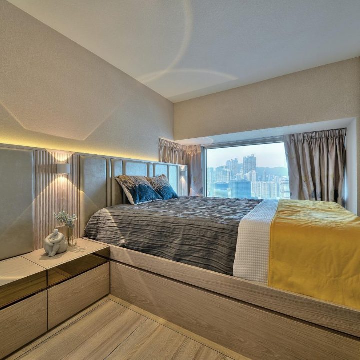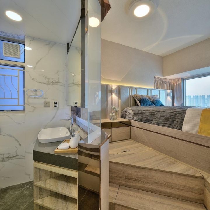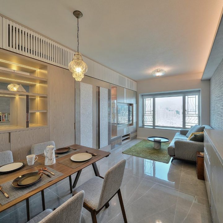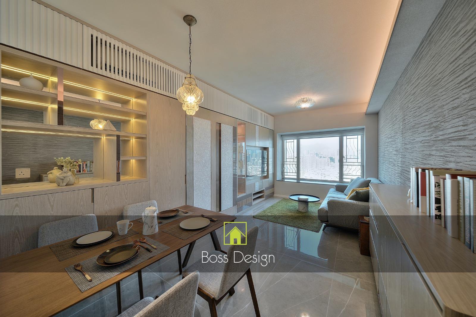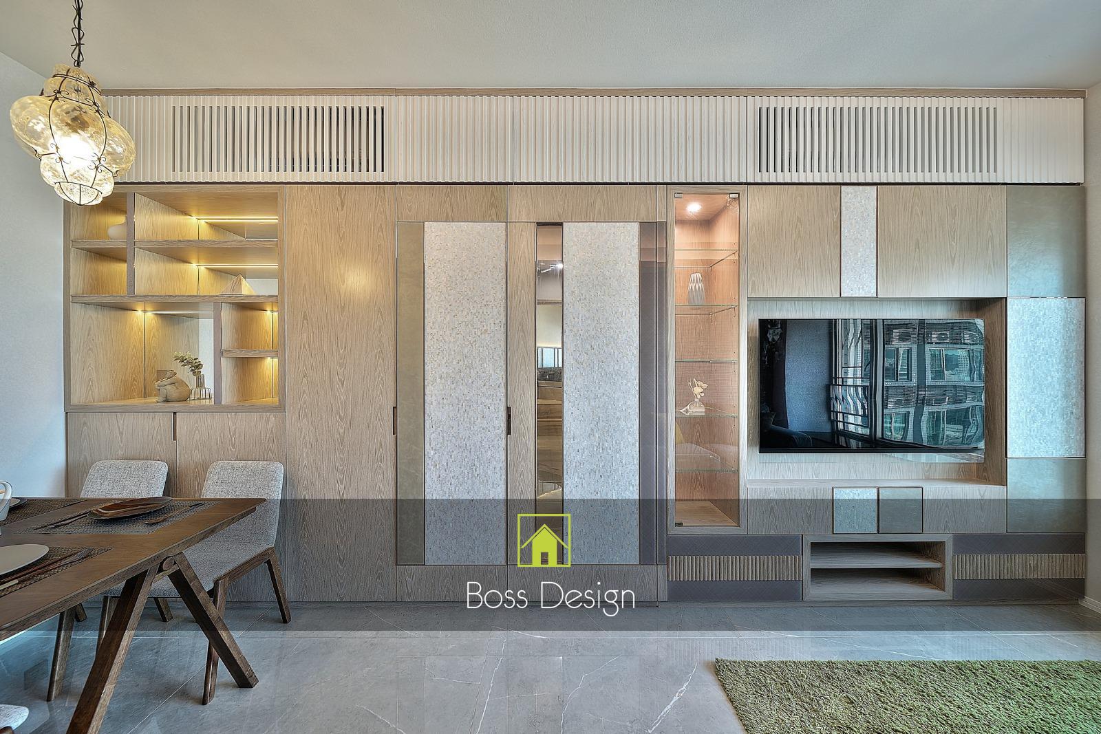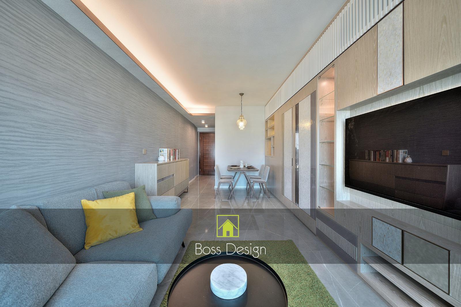 整體設計為簡約時尚的風格,簡單沙發與電視牆是集顏值與實用性為一體,石材地面起到點睛之筆,高貴大氣,兩邊拼接開放式的置物格以及底部裝抽屜櫃,滿足客廳置物的需求。一體開放式餐廳,視覺上擴寬空間。臥室背景牆刷成白色,營造大氣的休息空間。