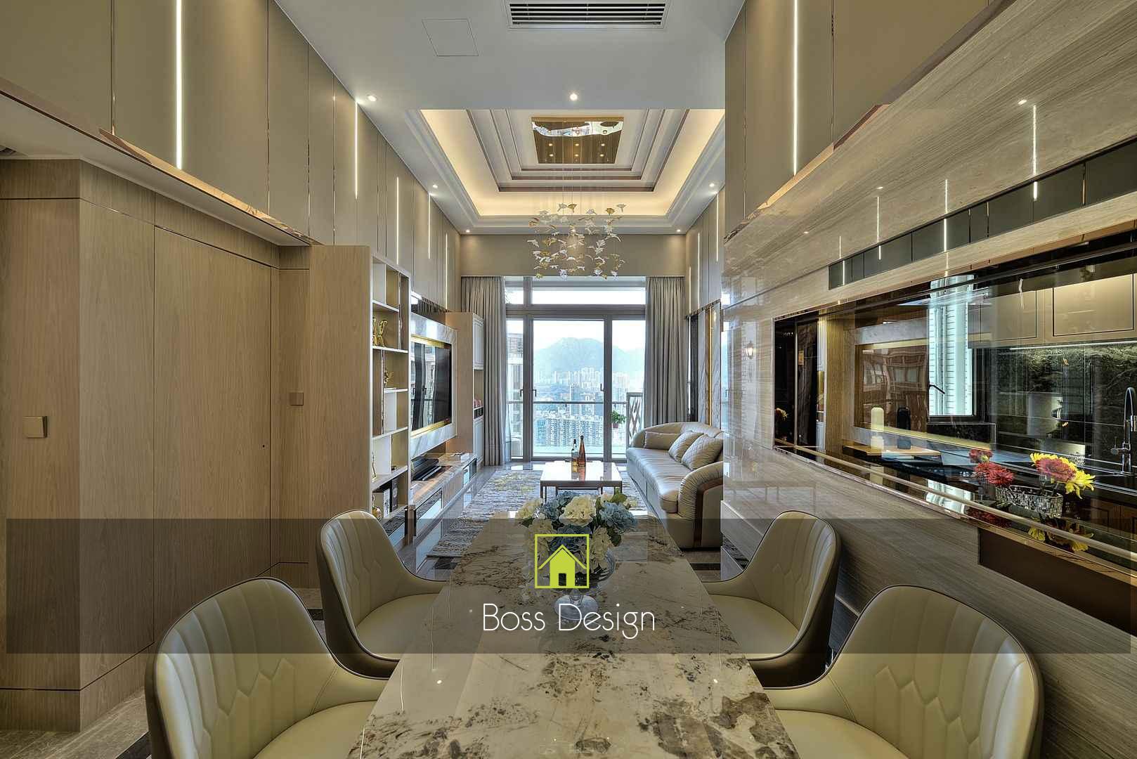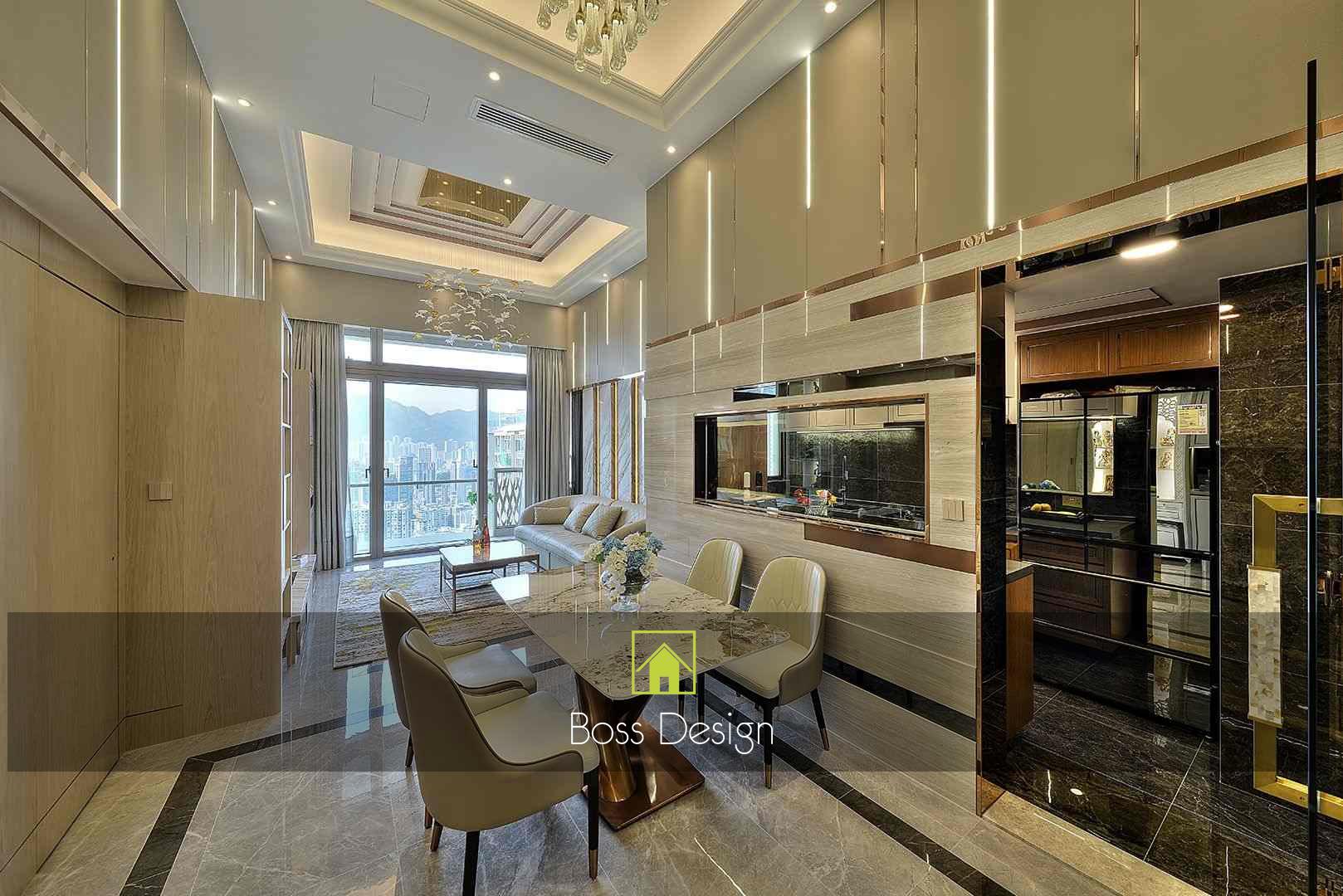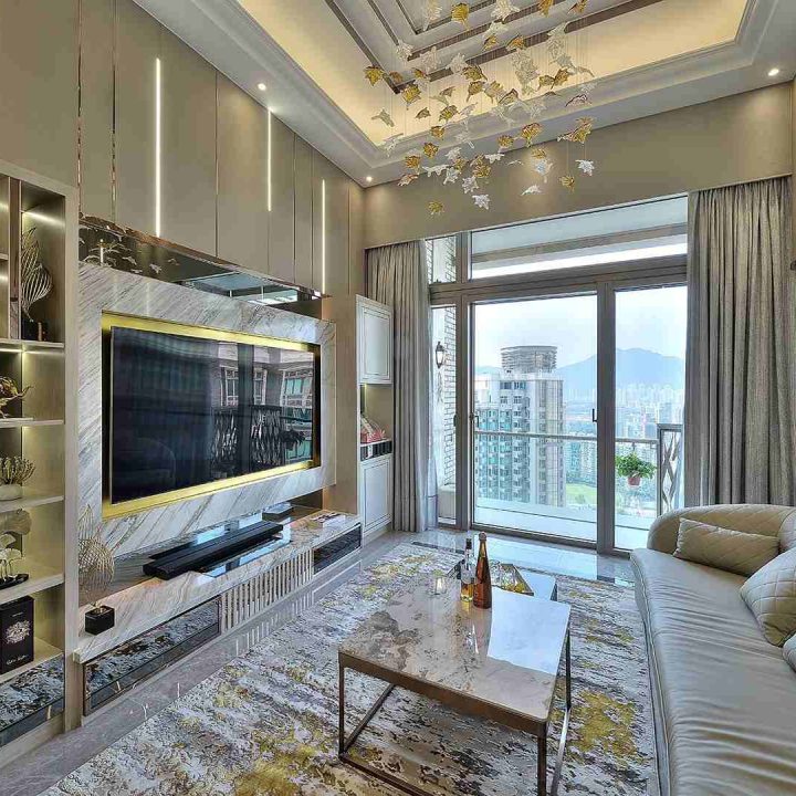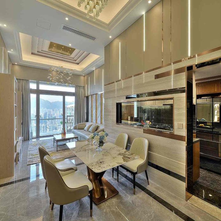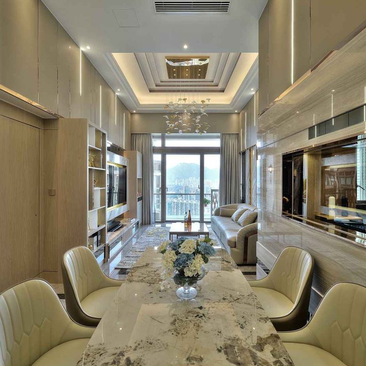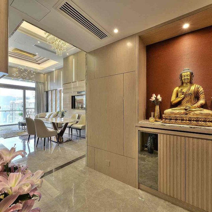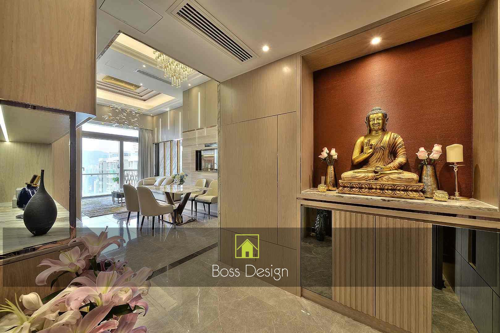 整個空間採用柔和的棕色與卡其色,大門玄關之神壇牆背採用棗紅色牆紙配合金色神像,莊嚴帶一點高貴,但整體格局又不會格格不入。以大理石的天然紋路作電視背景牆,優雅高級,再將地面與桌面加以協調統一,搭配個性立體天花燈及罕見的直型滲光圍身牆設計,營造奢華的氛圍。