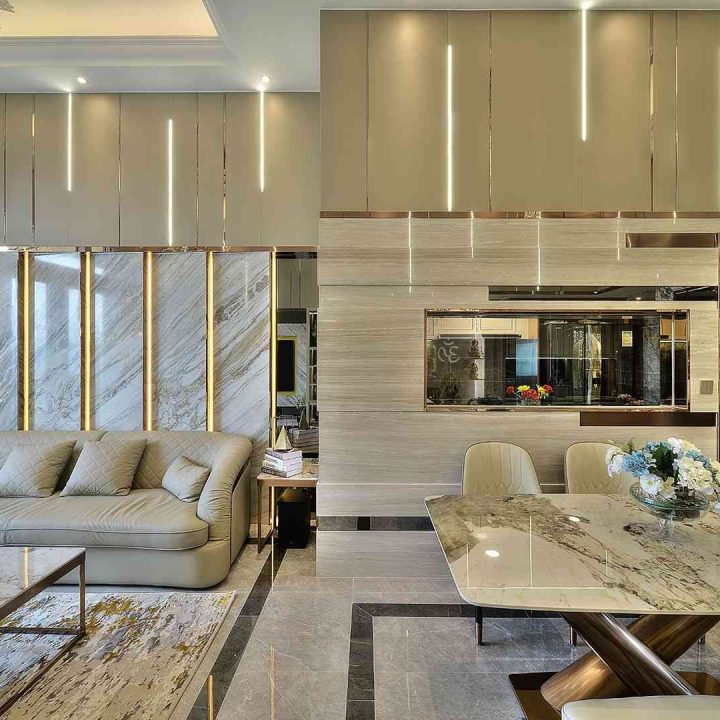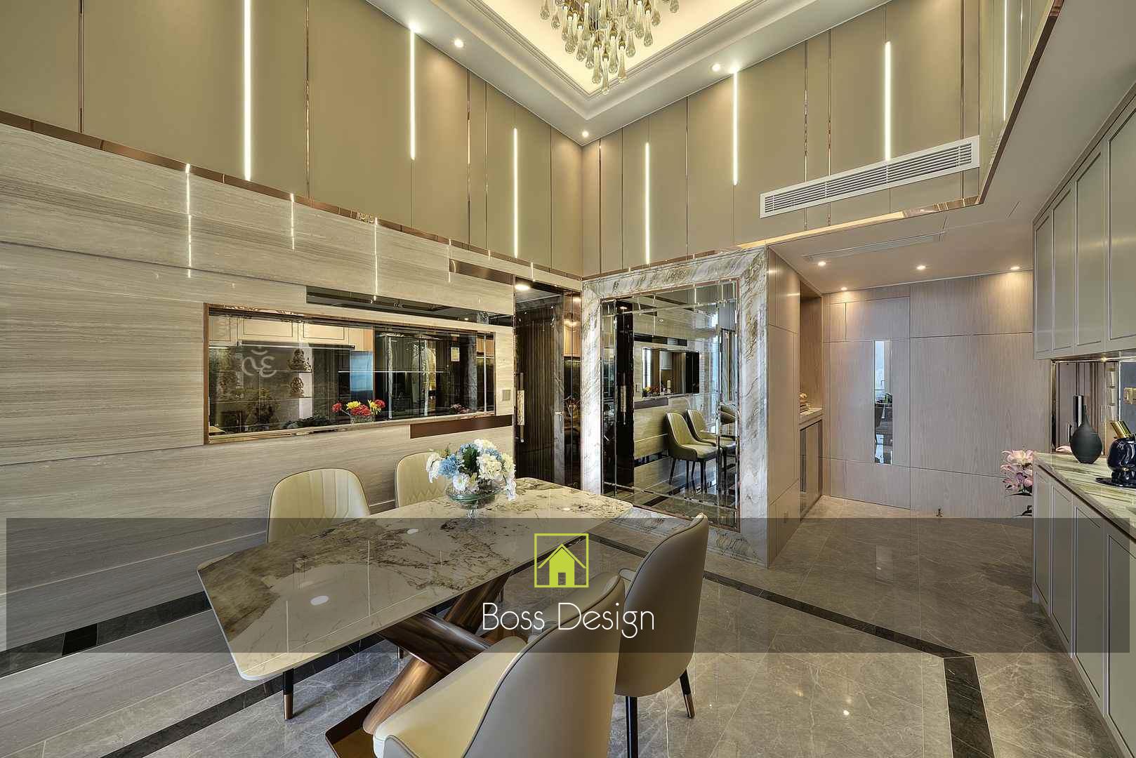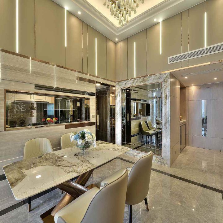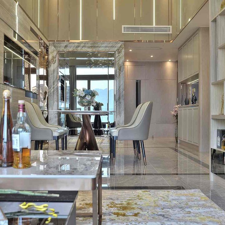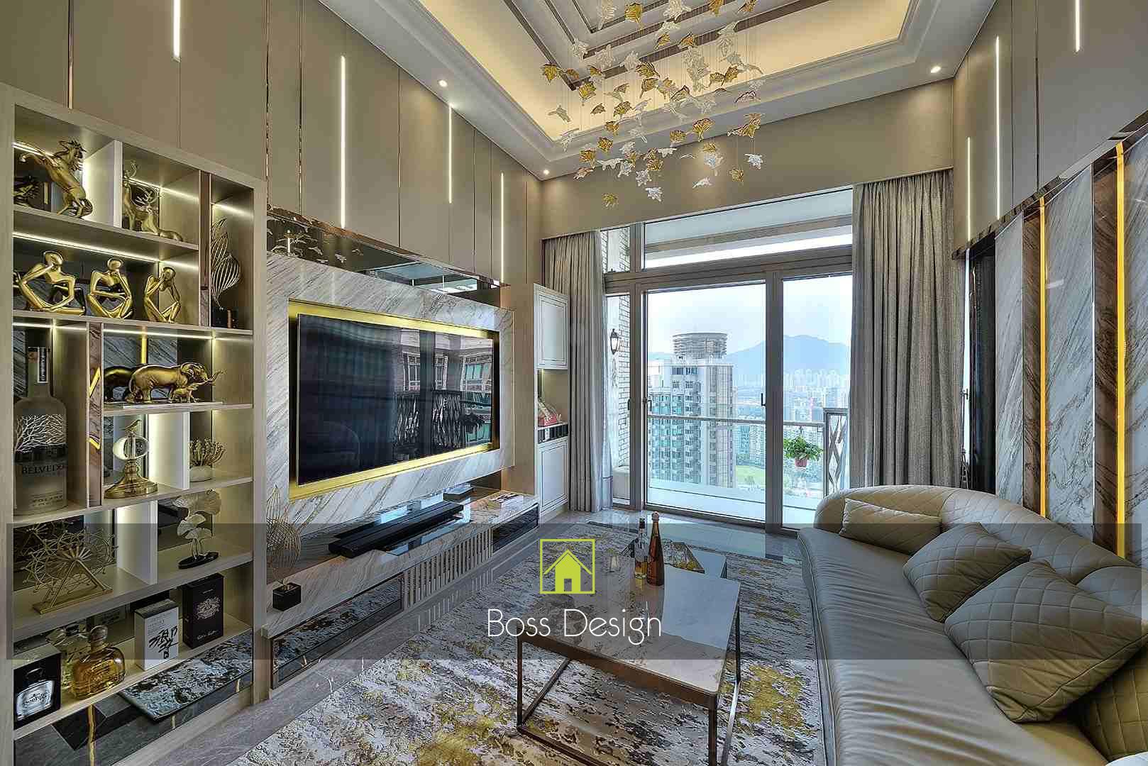 整個空間採用柔和的棕色與卡其色,大門玄關之神壇牆背採用棗紅色牆紙配合金色神像,莊嚴帶一點高貴,但整體格局又不會格格不入。以大理石的天然紋路作電視背景牆,優雅高級,再將地面與桌面加以協調統一,搭配個性立體天花燈及罕見的直型滲光圍身牆設計,營造奢華的氛圍。
