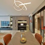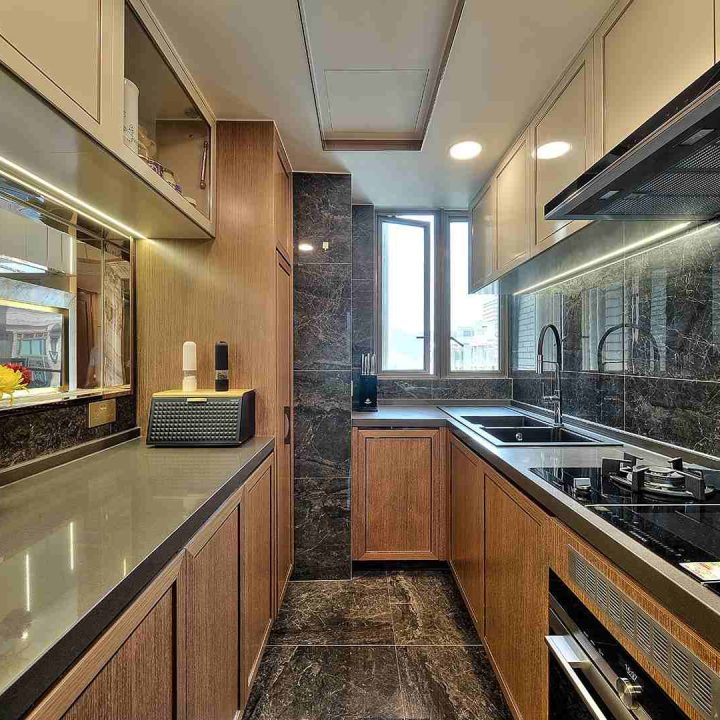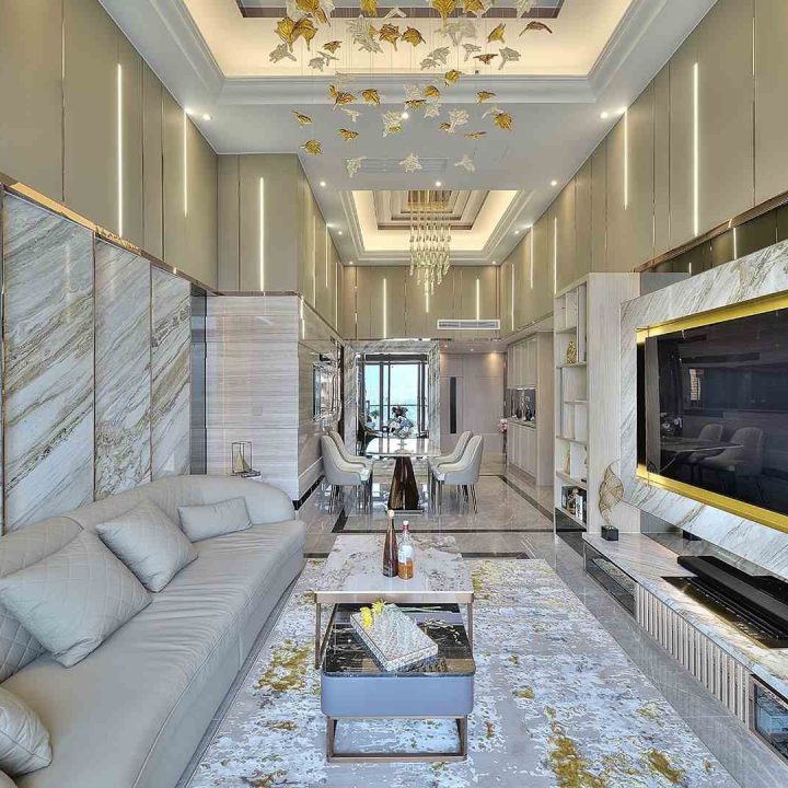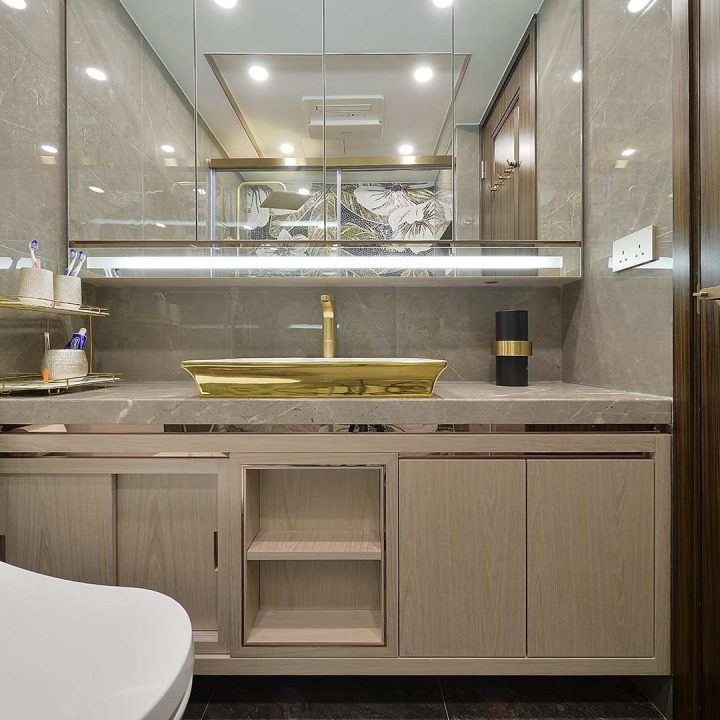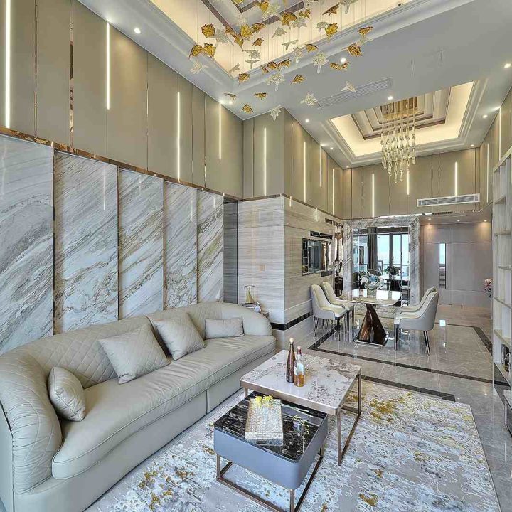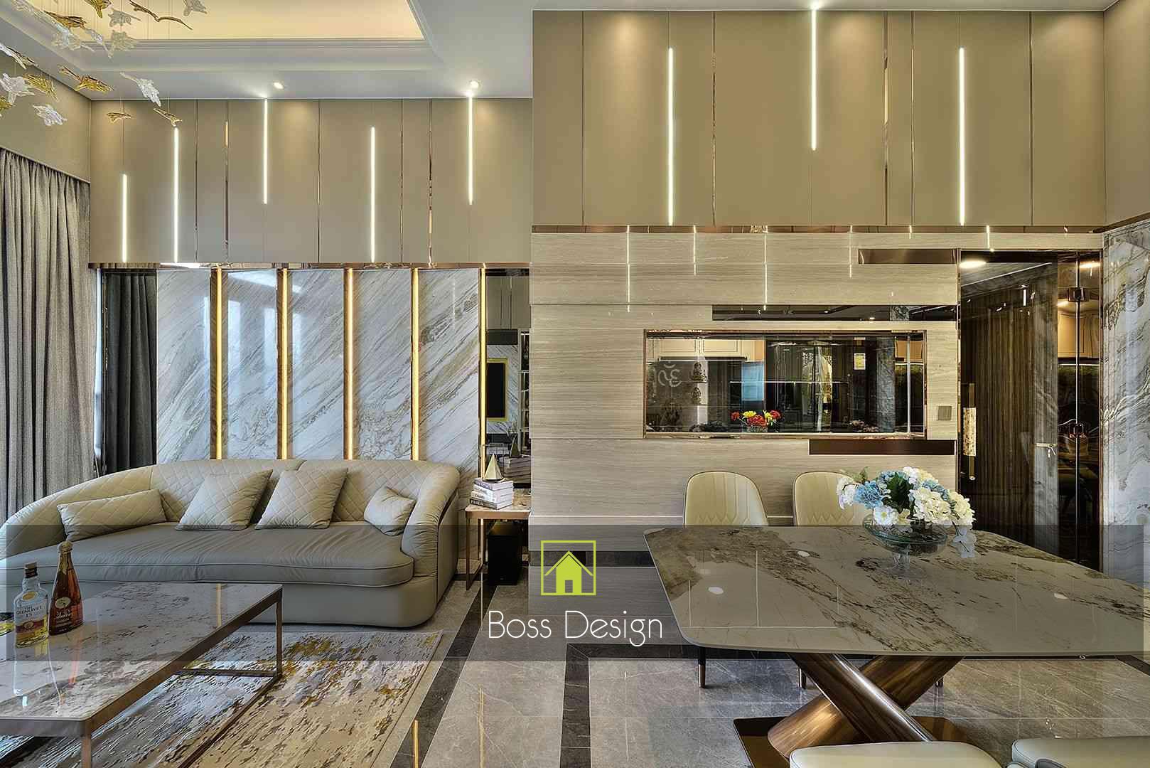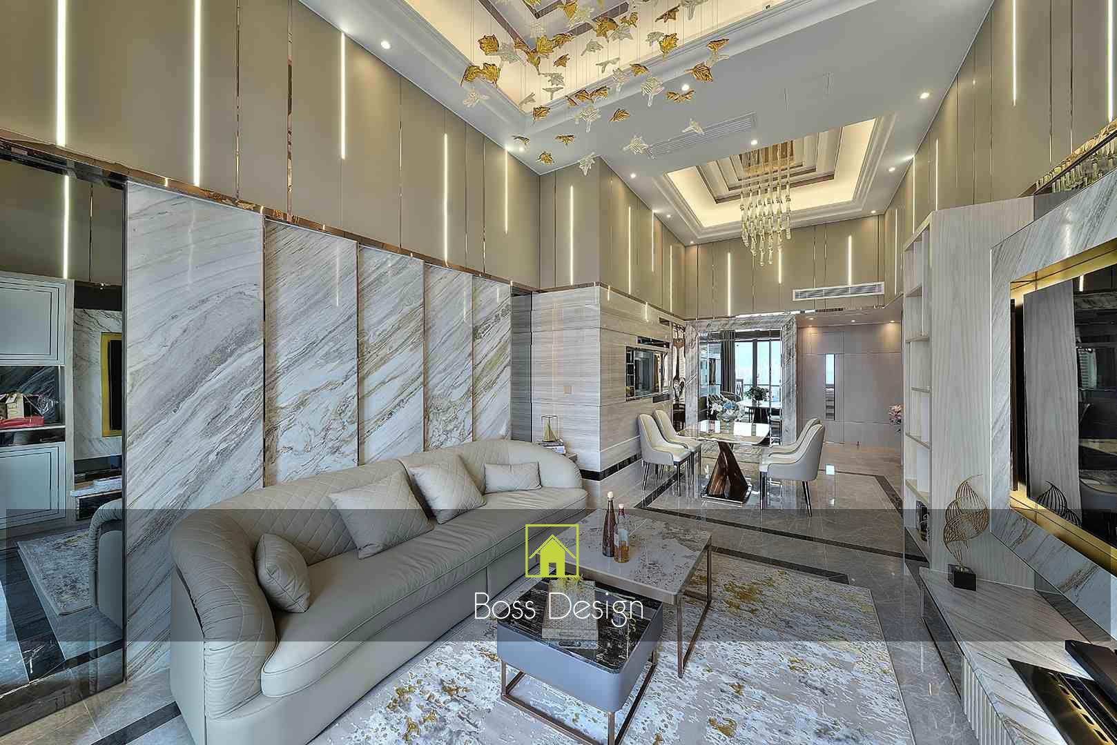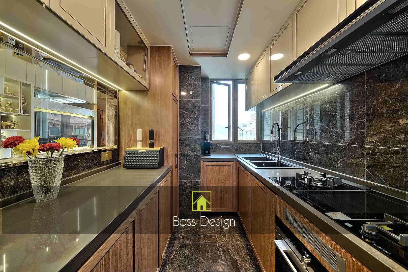 整個空間採用柔和的棕色與卡其色,大門玄關之神壇牆背採用棗紅色牆紙配合金色神像,莊嚴帶一點高貴,但整體格局又不會格格不入。以大理石的天然紋路作電視背景牆,優雅高級,再將地面與桌面加以協調統一,搭配個性立體天花燈及罕見的直型滲光圍身牆設計,營造奢華的氛圍。