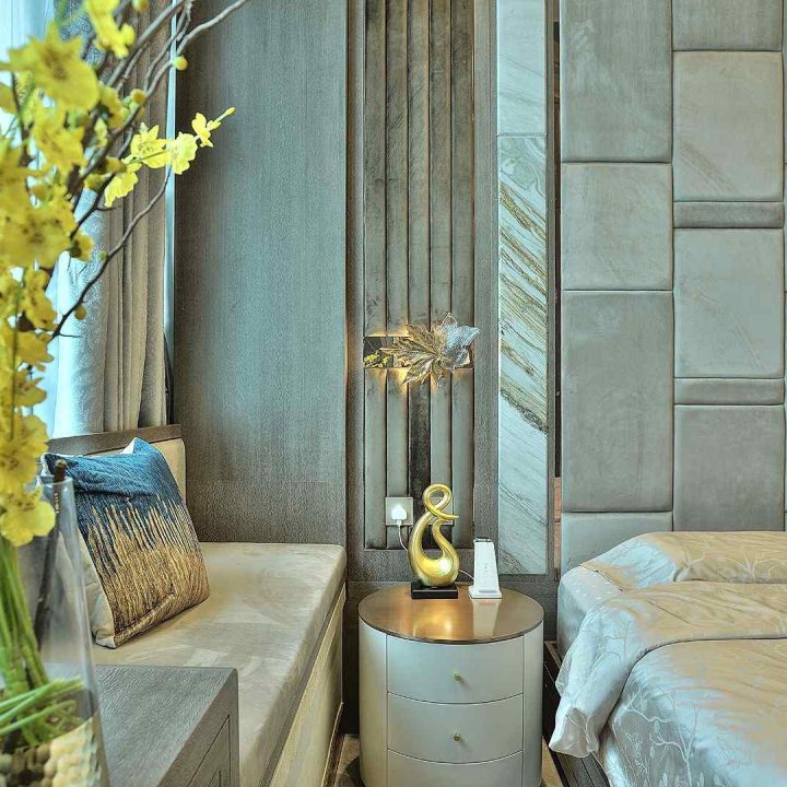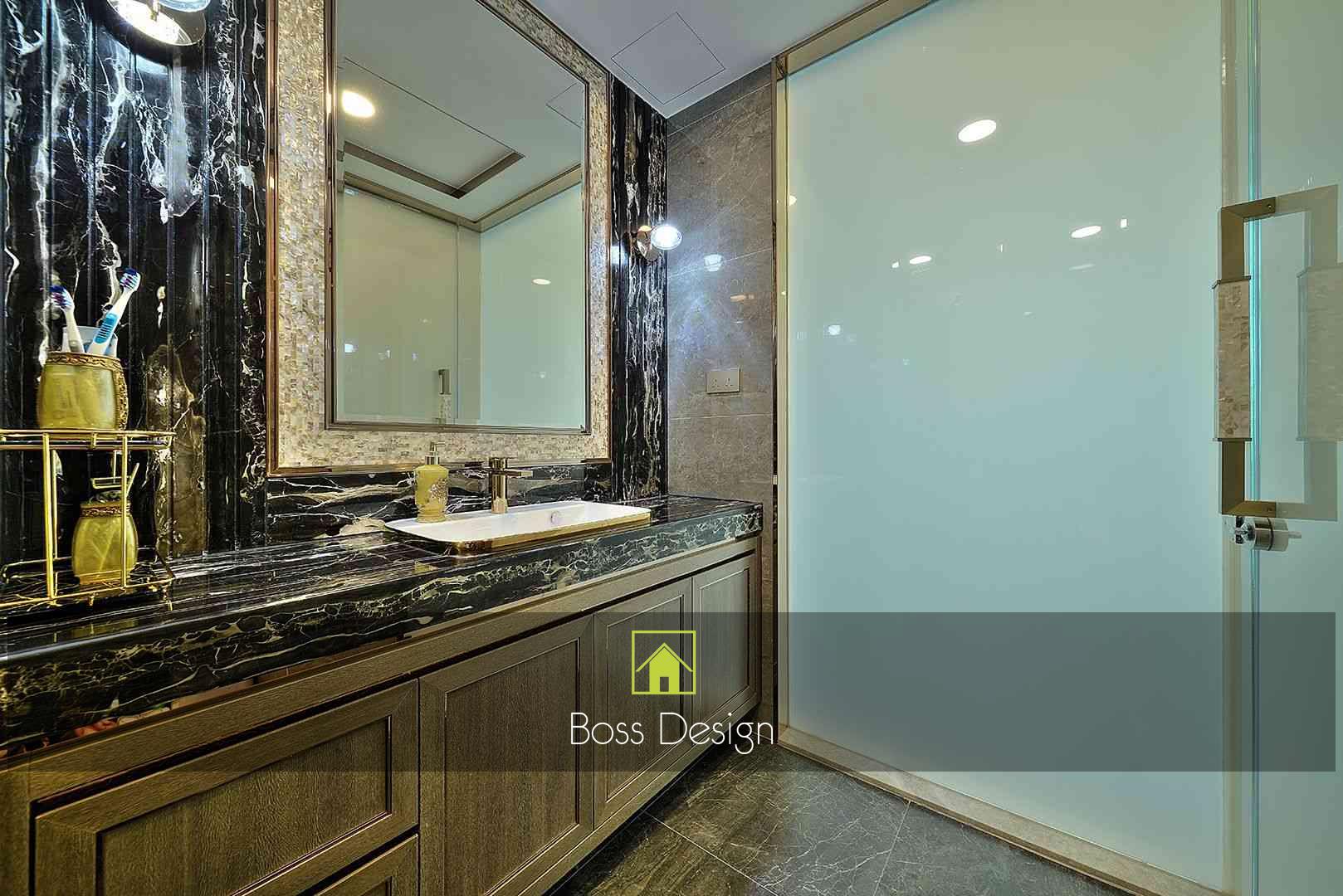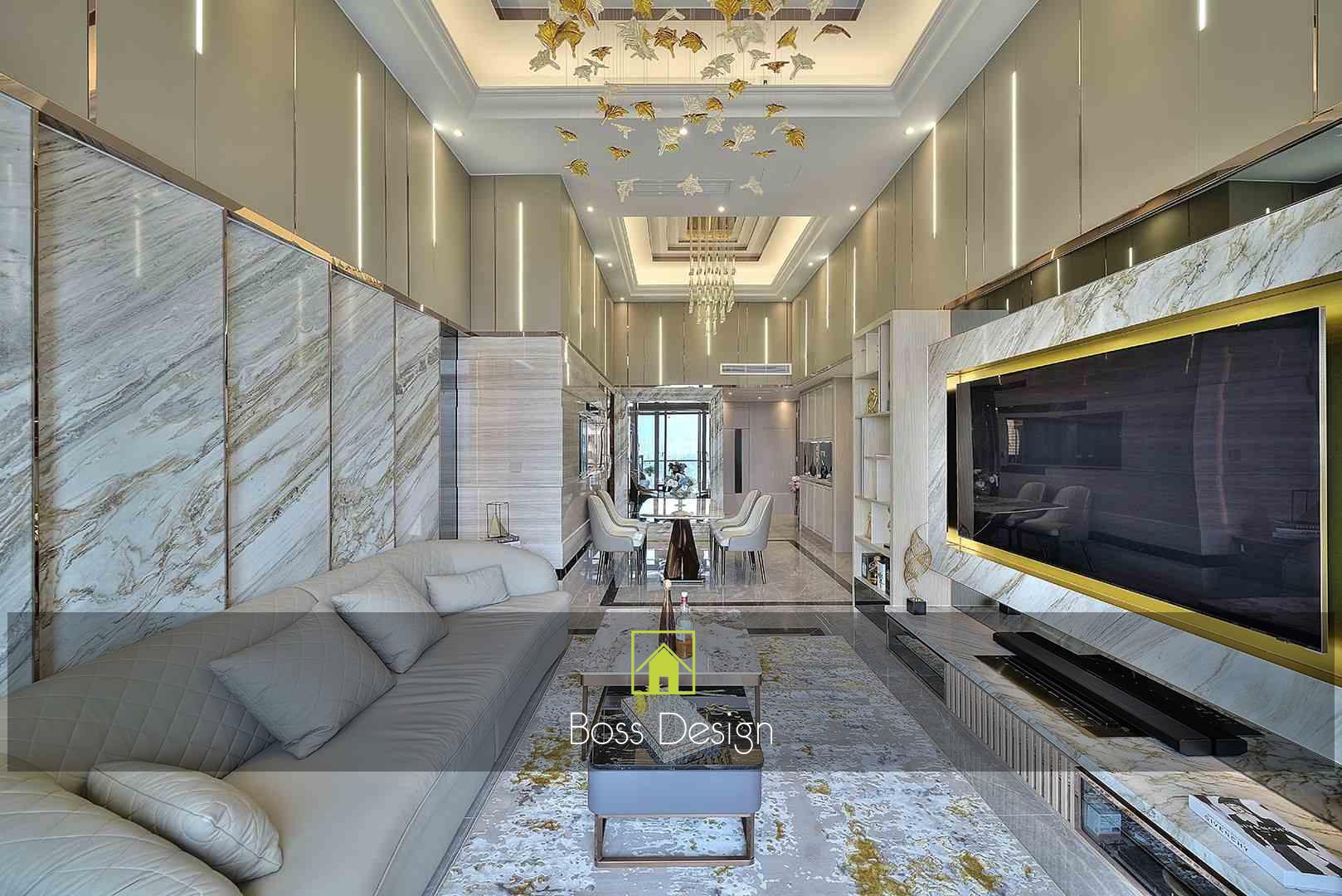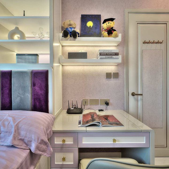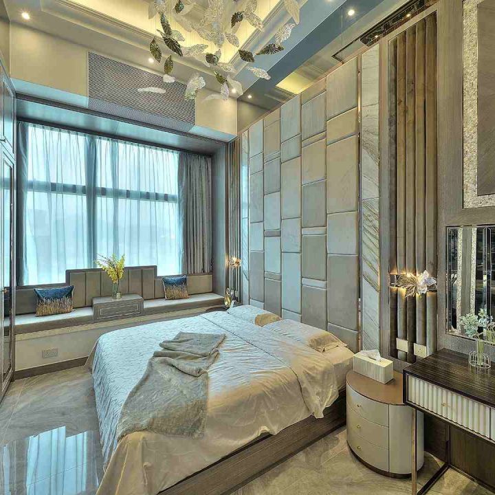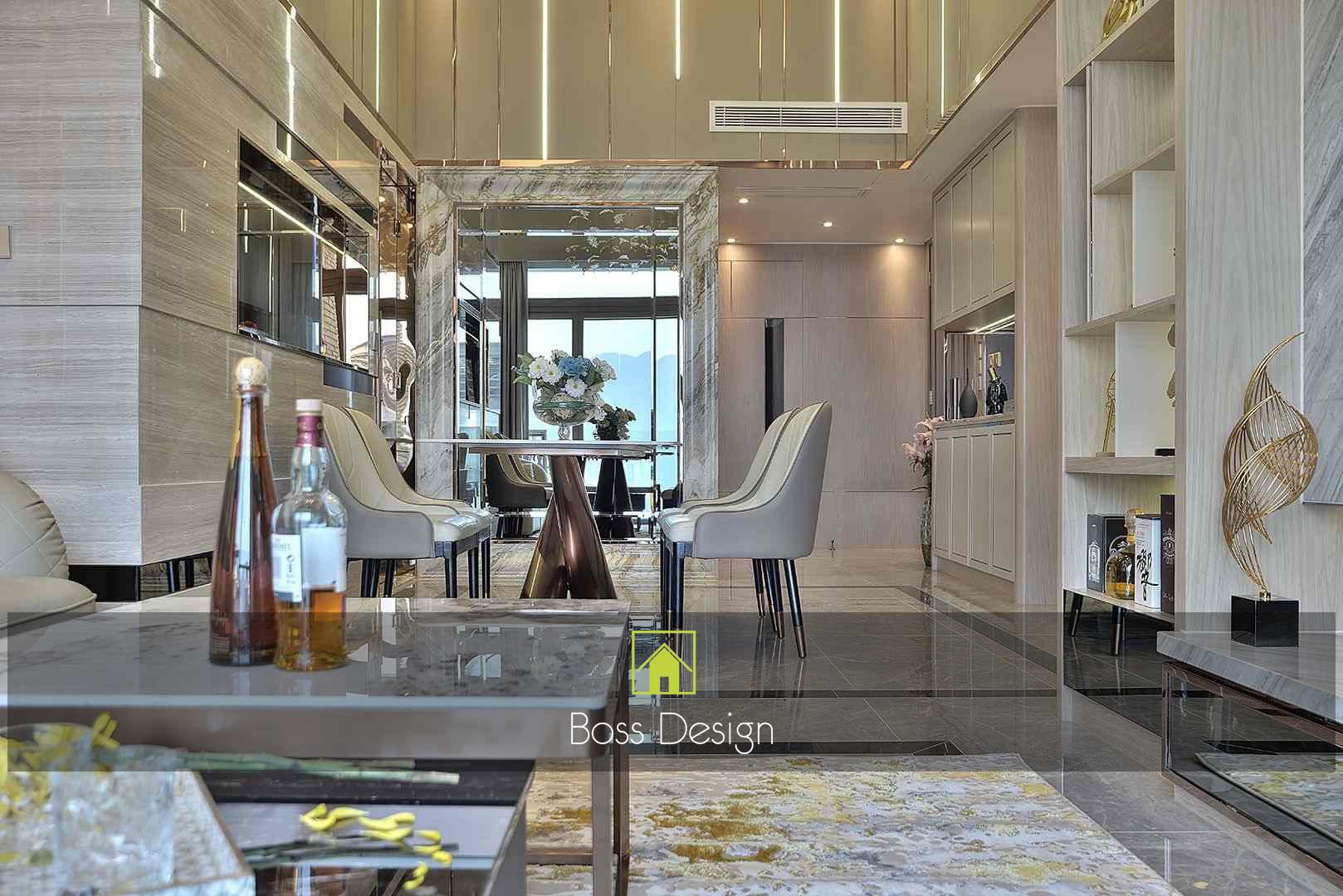 整個空間採用柔和的棕色與卡其色,大門玄關之神壇牆背採用棗紅色牆紙配合金色神像,莊嚴帶一點高貴,但整體格局又不會格格不入。以大理石的天然紋路作電視背景牆,優雅高級,再將地面與桌面加以協調統一,搭配個性立體天花燈及罕見的直型滲光圍身牆設計,營造奢華的氛圍。