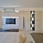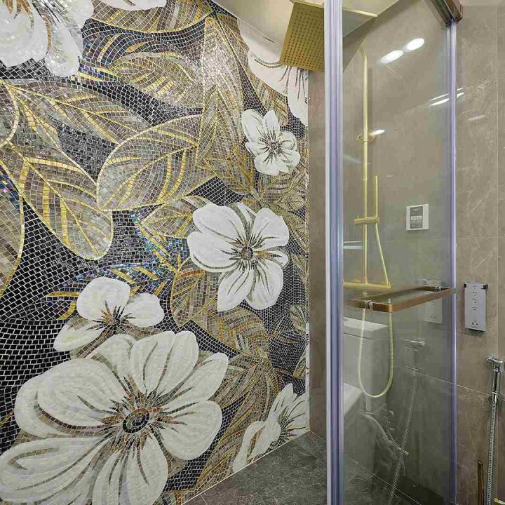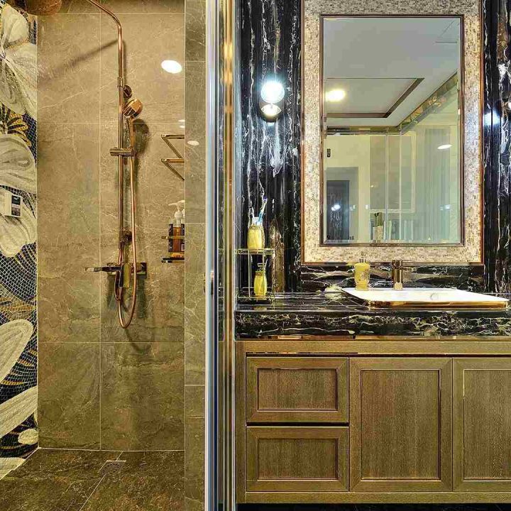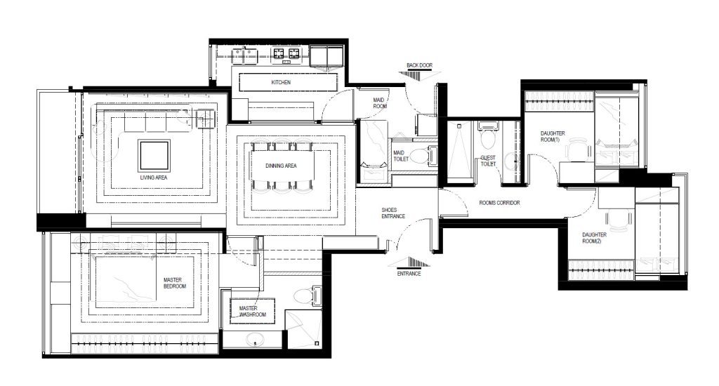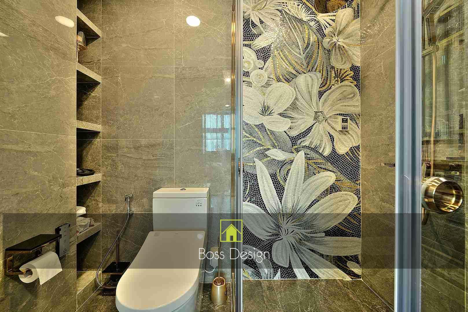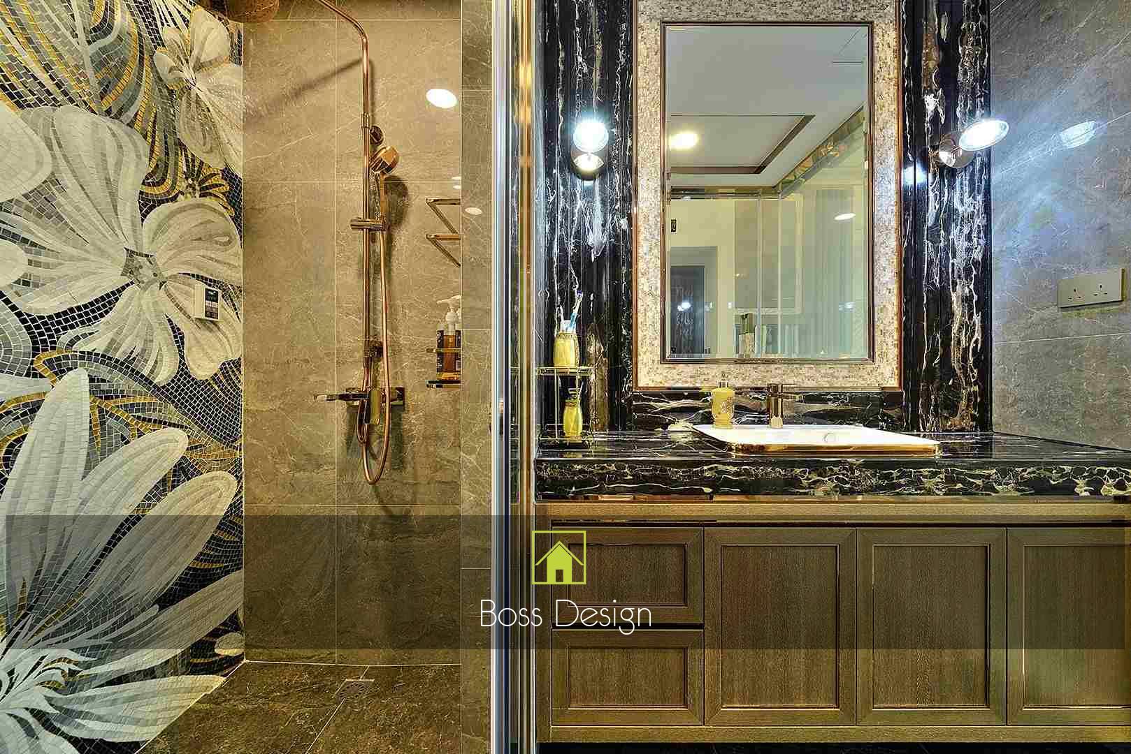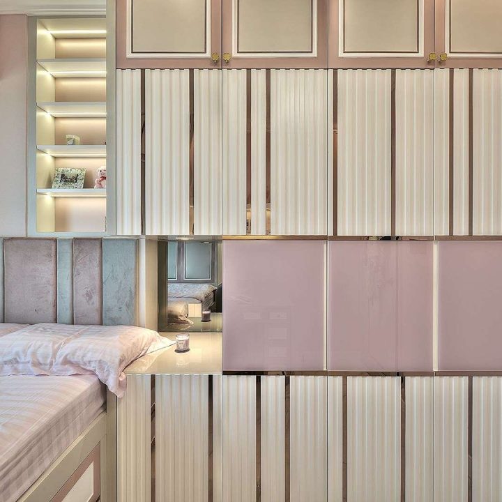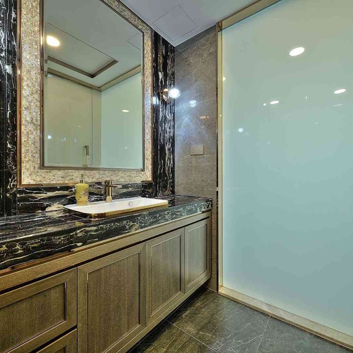 整個空間採用柔和的棕色與卡其色,大門玄關之神壇牆背採用棗紅色牆紙配合金色神像,莊嚴帶一點高貴,但整體格局又不會格格不入。以大理石的天然紋路作電視背景牆,優雅高級,再將地面與桌面加以協調統一,搭配個性立體天花燈及罕見的直型滲光圍身牆設計,營造奢華的氛圍。