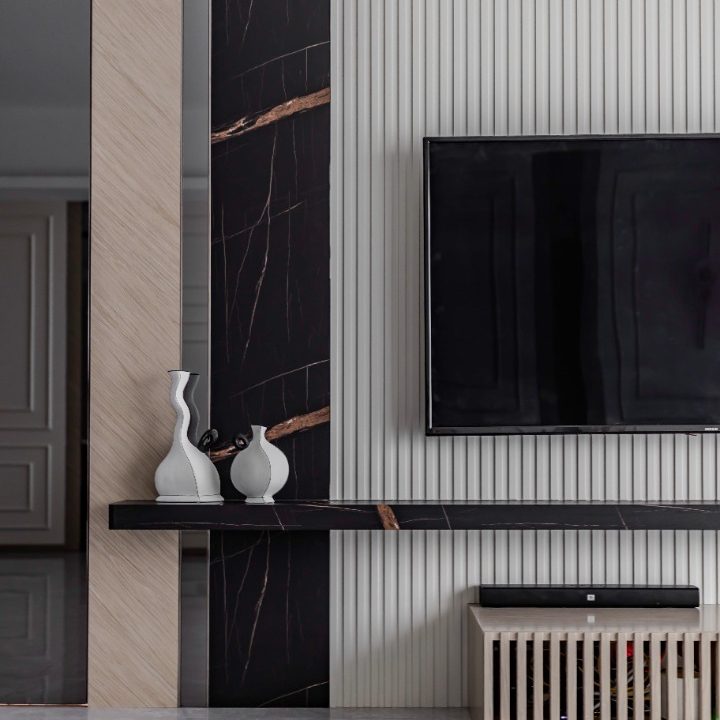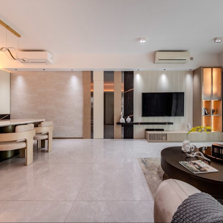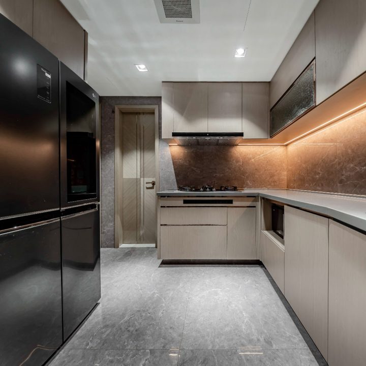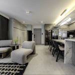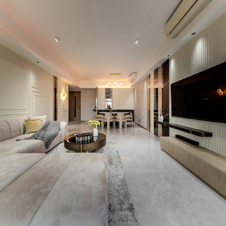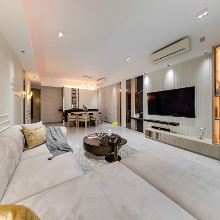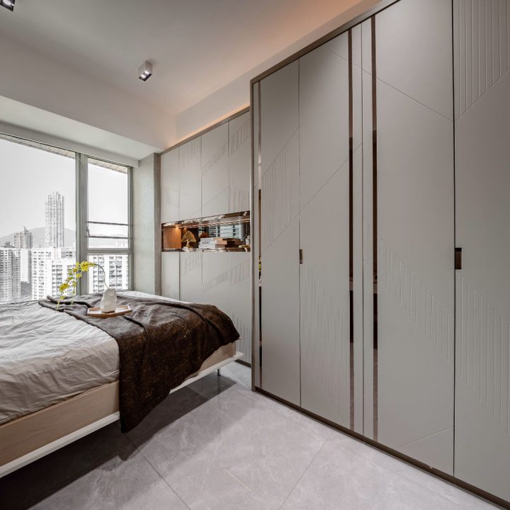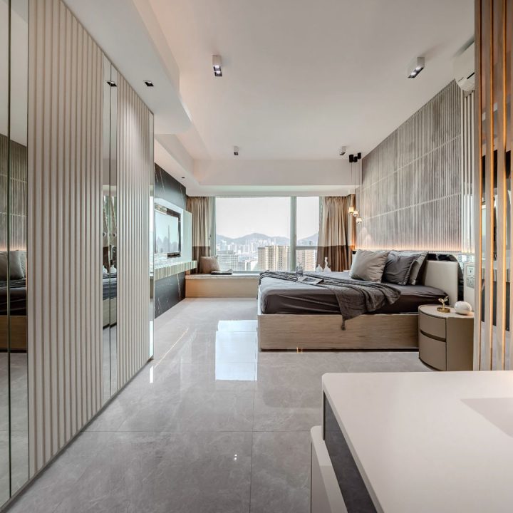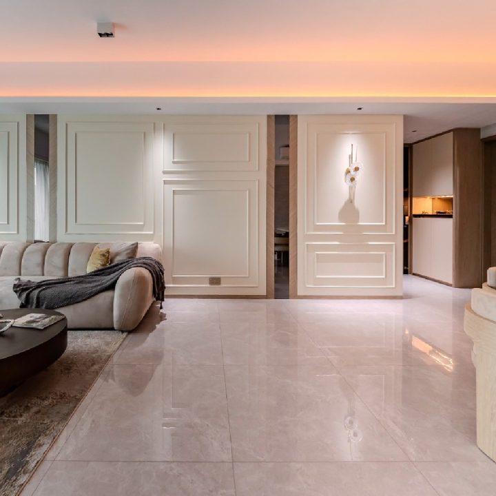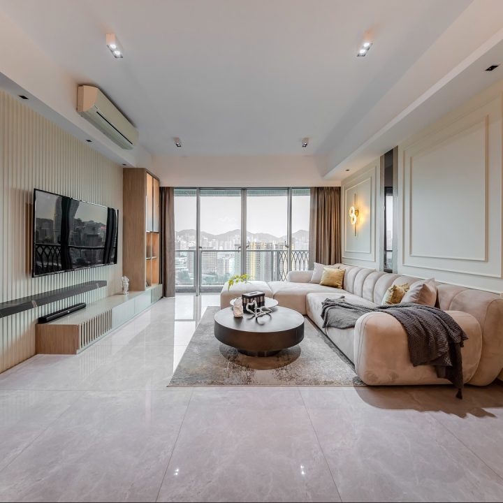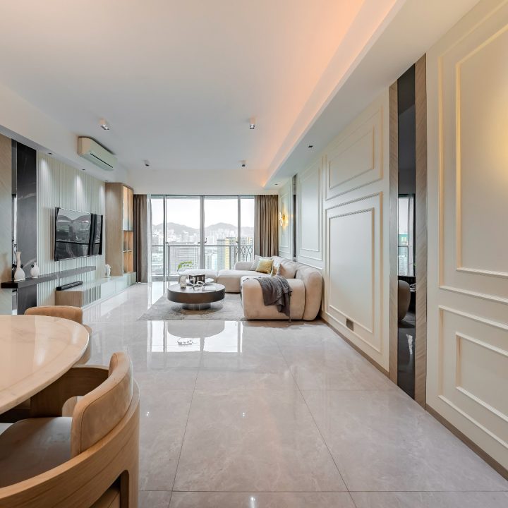 在這座何文田君頤峰的1,321呎豪宅中,設計師以精湛的手法將現代輕奢風格與藝術氣息完美結合,為品味獨到的業主打造出一個兼具美學與功能性的理想居所。步入寬敞的客廳,首先映入眼簾的是地面鋪設的灰色雲石瓷磚,其冷冽的光澤與牆面米白色歐陸風線條形成優雅對比。一張質感溫潤的卡其色絨布沙發成為空間焦點,不僅柔化了石材的冷硬感,更與玫瑰金金屬飾條相得益彰。設計師巧妙運用材質的碰撞 – 石材的剛硬、絨布的柔軟、金屬的光澤,在統一的色調中創造出豐富的層次感。