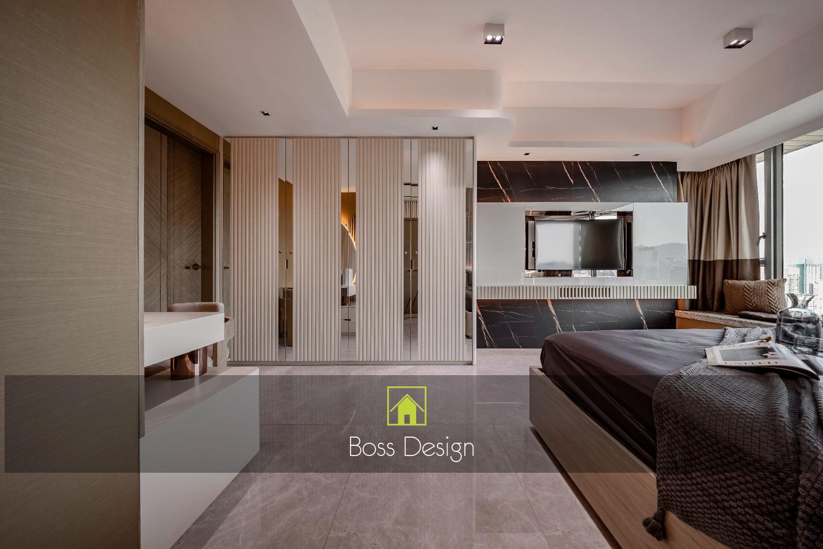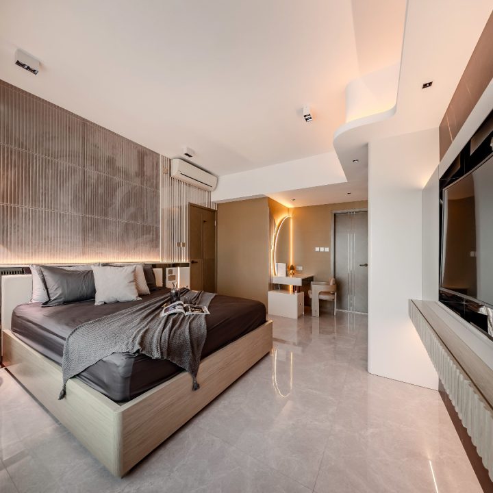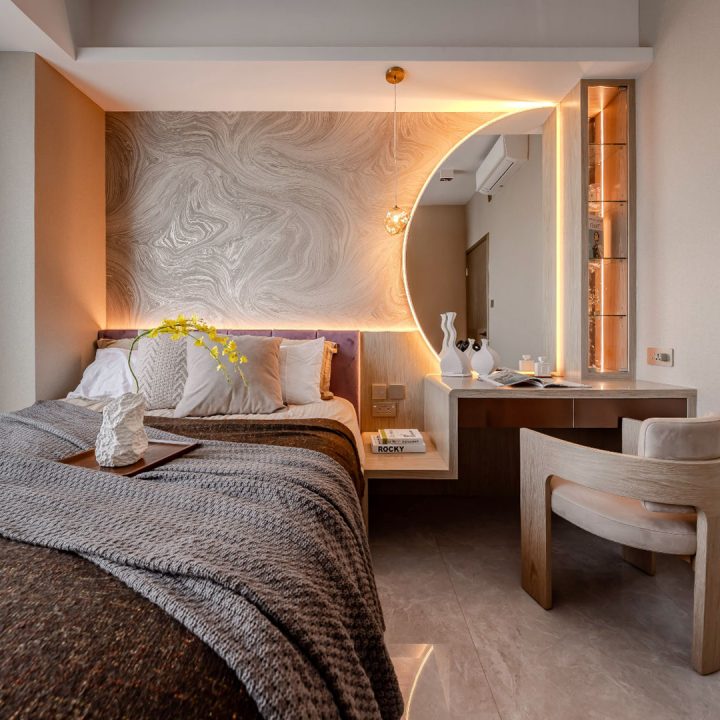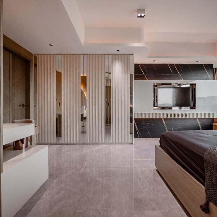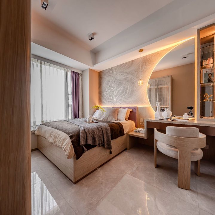 The master suite stands out as a design highlight. The 3D upholstered feature wall behind the bed uses imported European materials, with its textured surface creating captivating light and shadow play under illumination. The walk-in closet’s full-mirror design not only serves practical purposes but also visually expands the space. The master bathroom extends the marble theme, with dual vanity sinks and rose gold fixtures showcasing luxurious details.