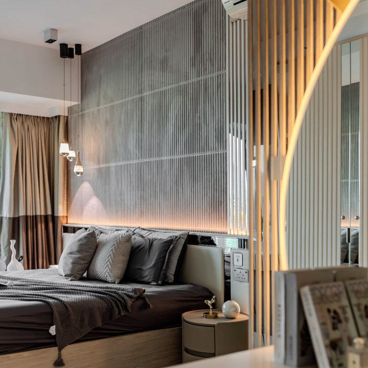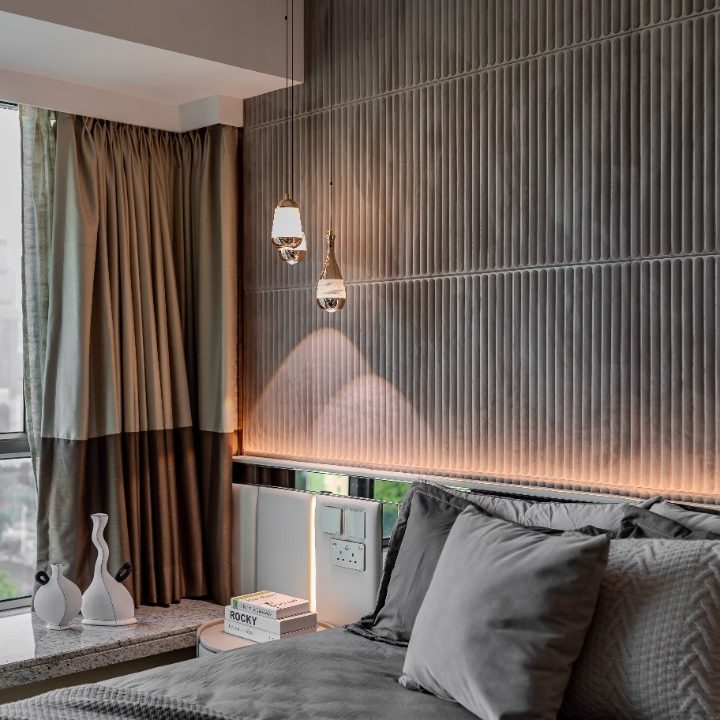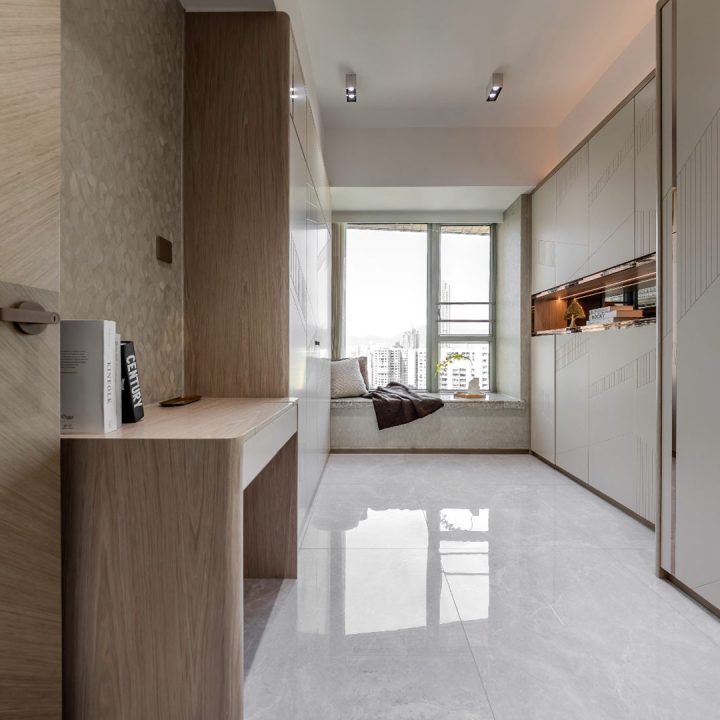 The daughter’s room breaks away from the main area’s restraint, expressing youthful energy through funky styling. One wall features geometric patterned wallpaper full of playful charm, while another incorporates writable glass panels that can evolve with the young occupant’s growth. The designer has also created a dedicated reading nook with distinctive lighting, forming a creative personal space.