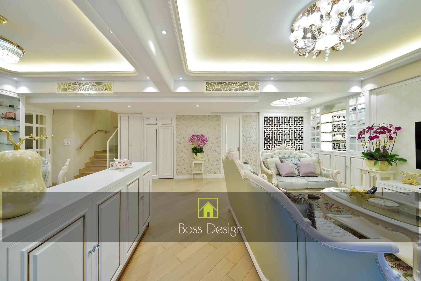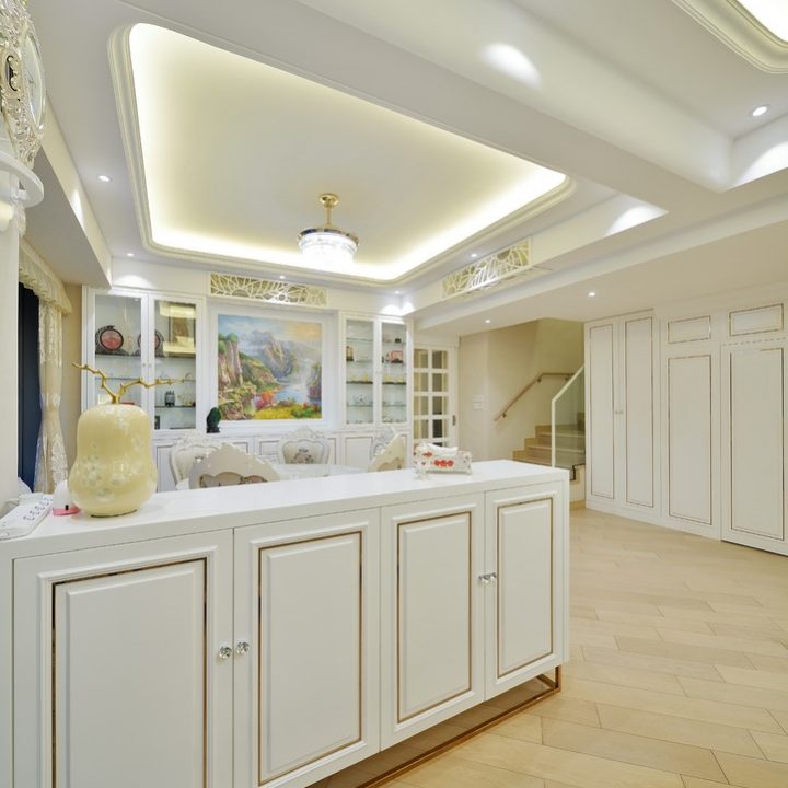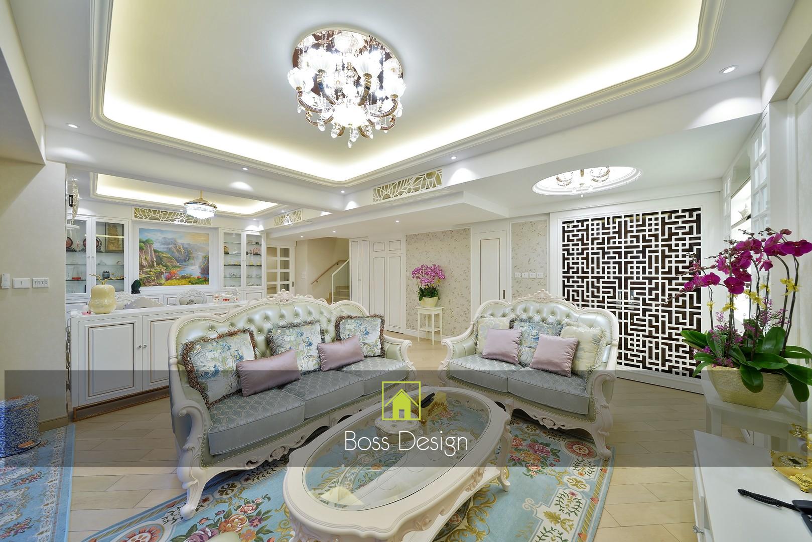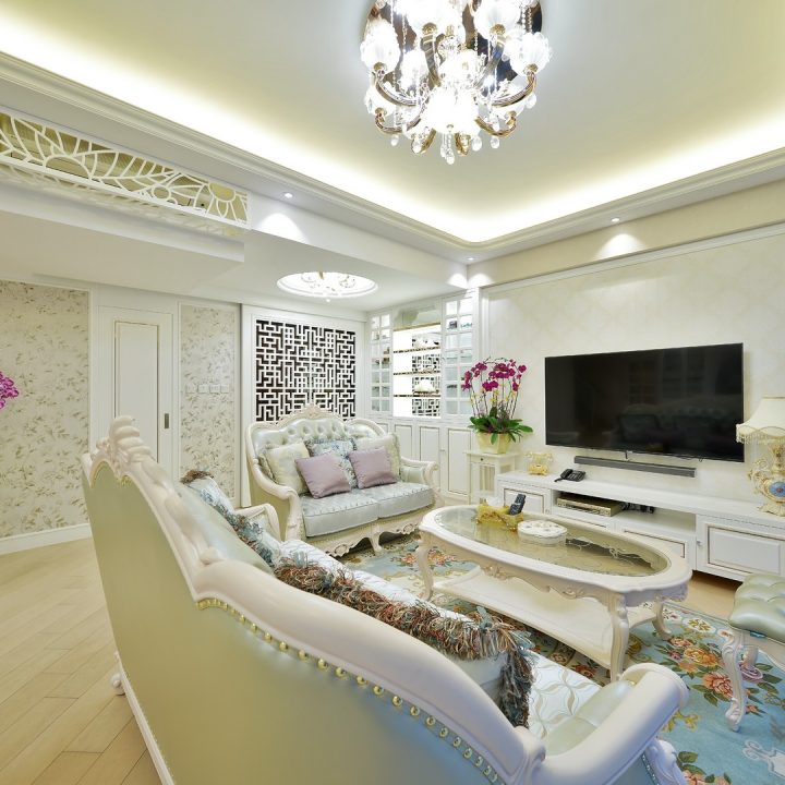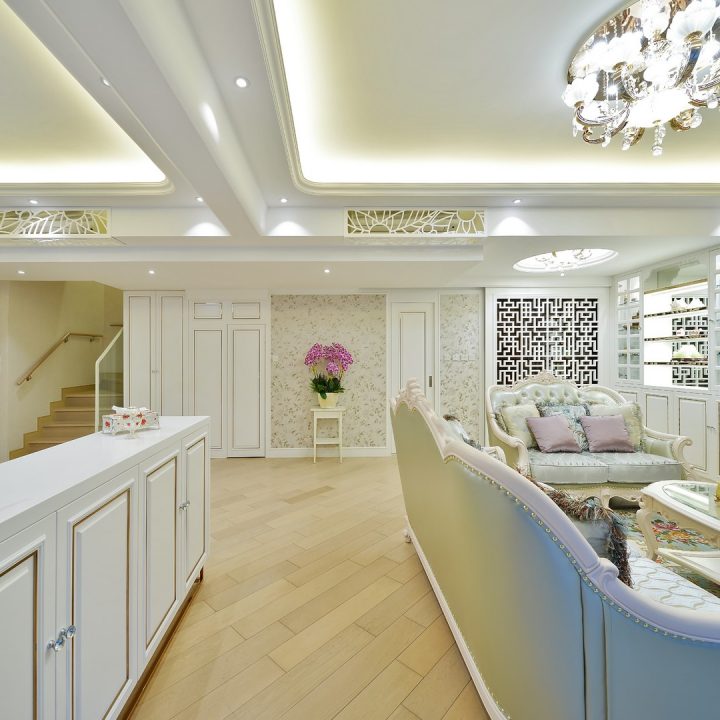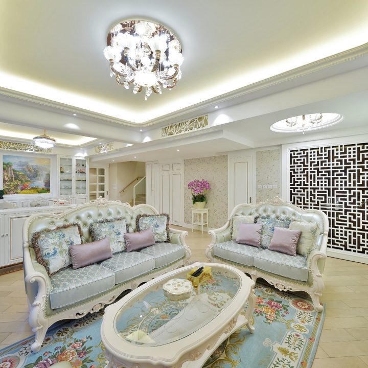多彩的織物、精美的地毯以及精緻的壁畫,使得整個風格豪華、富麗,在配飾上,黃色和藍色的配飾襯托出古典傢俱的高貴與優雅,賦予古典美感的窗簾和地毯、造型華麗的吊燈使整個空間看起來大方典雅,柔和的淺色花藝還帶來了柔美的氣質。