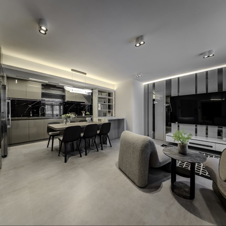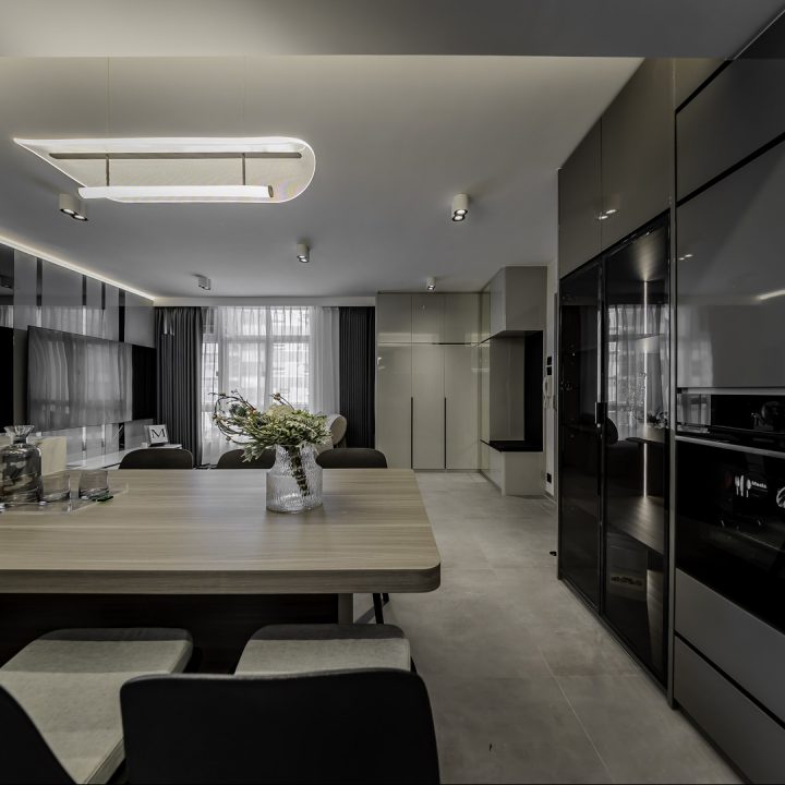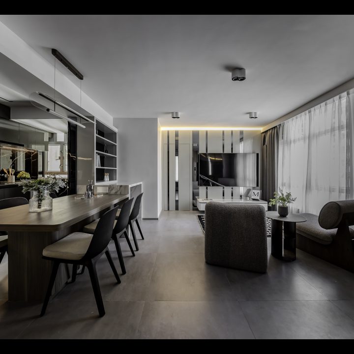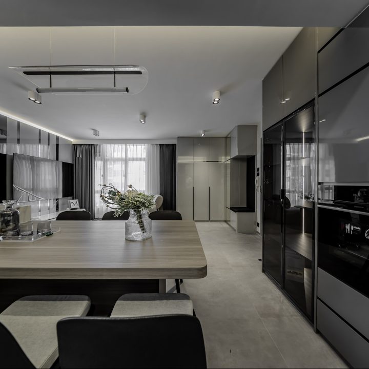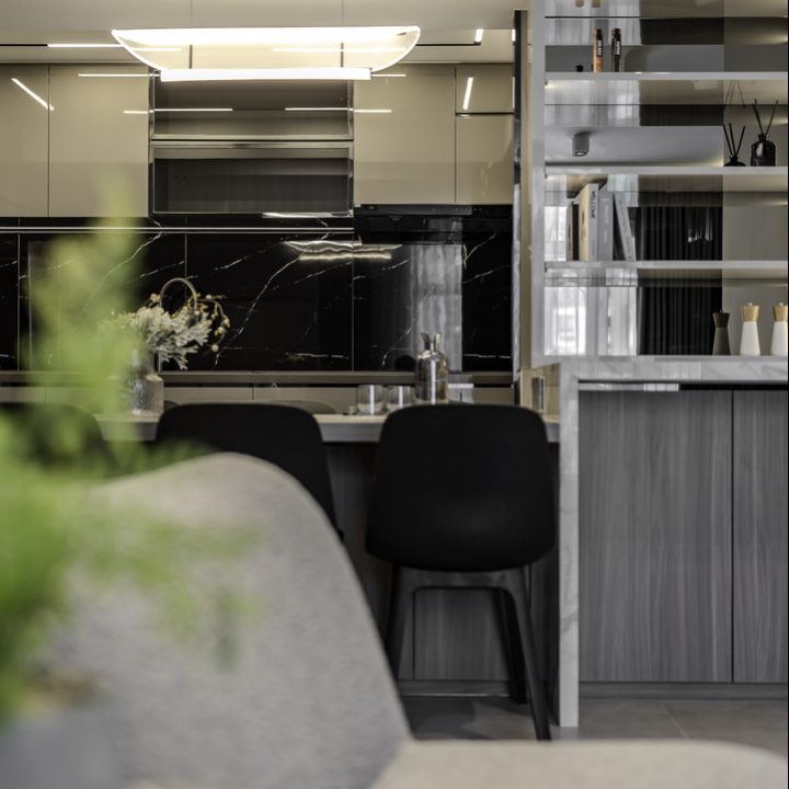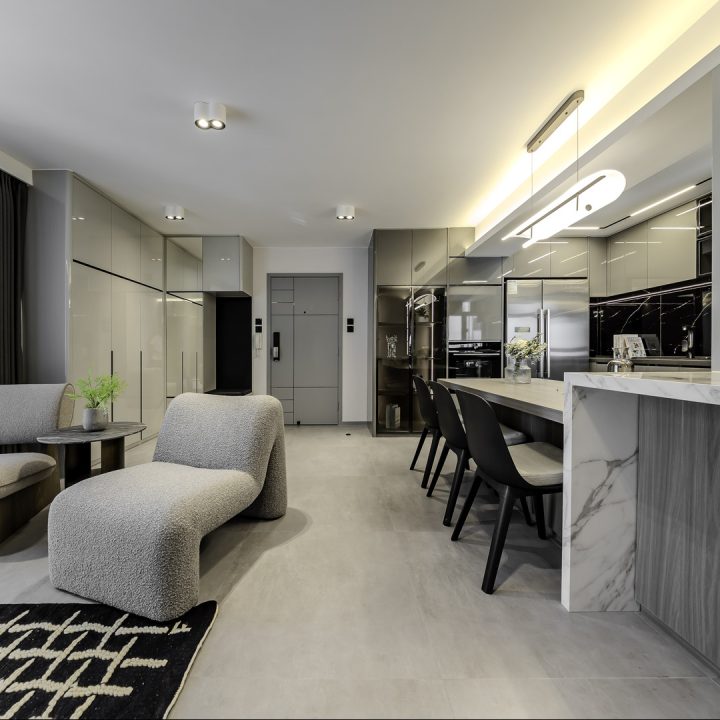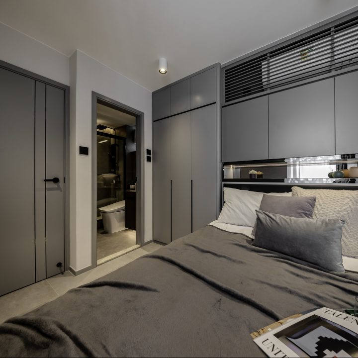 這次為太古城的三房單位設計,客戶希望打造一個時尚簡約的居住空間,並以全灰色作為主調。我們在設計中充分尊重客戶的需求,以灰色為核心,但通過不同材質和深淺度的變化,避免單調感。例如,傢俬採用光面噴漆,呈現現代感;地台鋪設水泥灰色磁磚,增添質感;牆身則選用極淺灰色油漆,營造柔和氛圍。同時,我們巧妙地加入黑色元素作為對比,如黑色不鏽鋼和黑色雲石瓷磚,提升空間的層次與視覺張力。