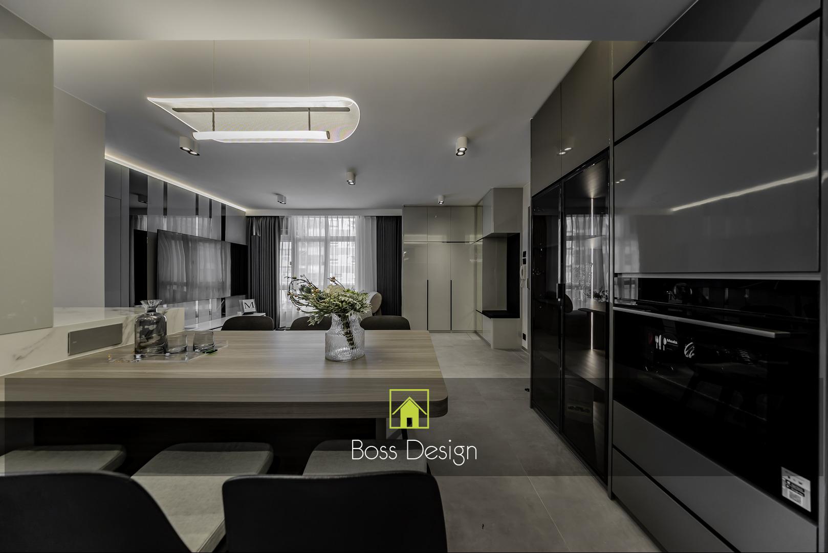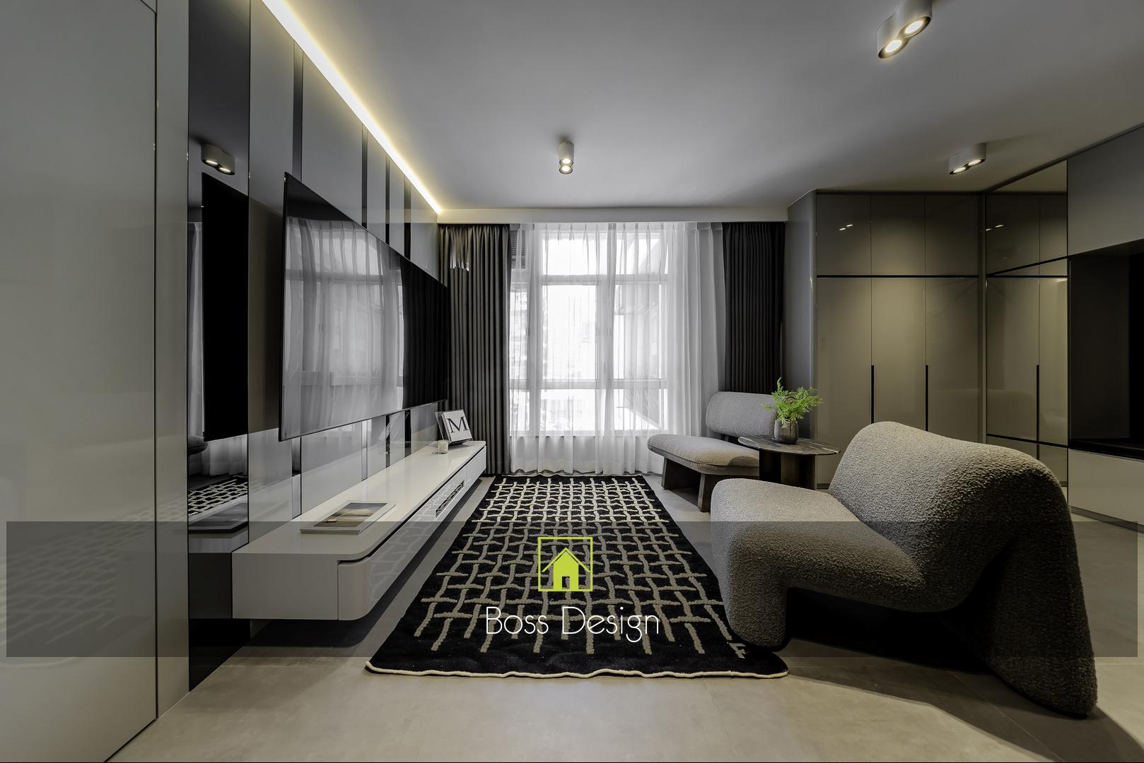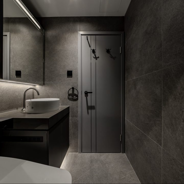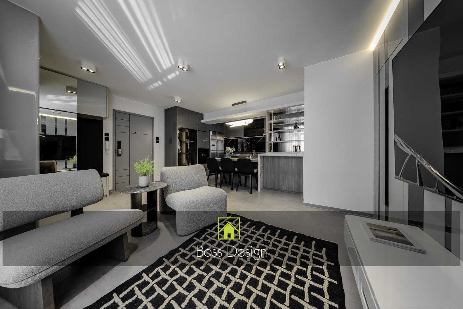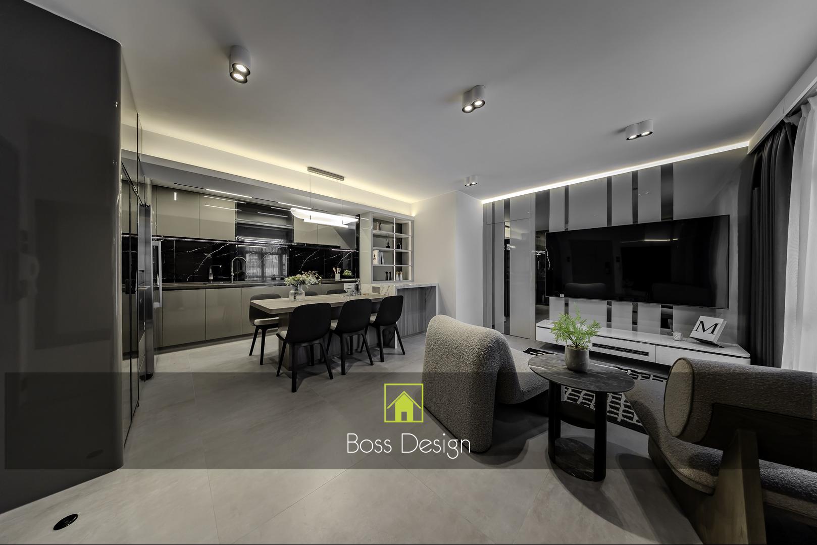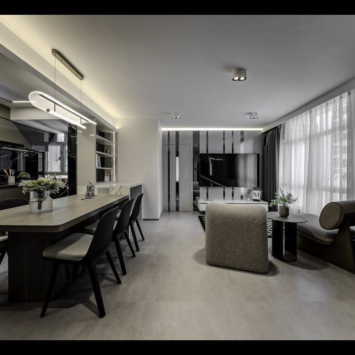 燈光設計上,我們採用3000K色溫,營造溫暖舒適的氛圍,並在天花均勻分布盒仔燈,打造出類似攝影棚的效果,既美觀又實用。整體設計雖然以灰色為主,但通過深淺變化和黑色點綴,呈現出自然和諧的效果,完美契合屋主年輕才俊的品味。這個空間不僅時尚簡約,更充滿現代感,為客戶一家三口提供了一個舒適而富有格調的家居環境。