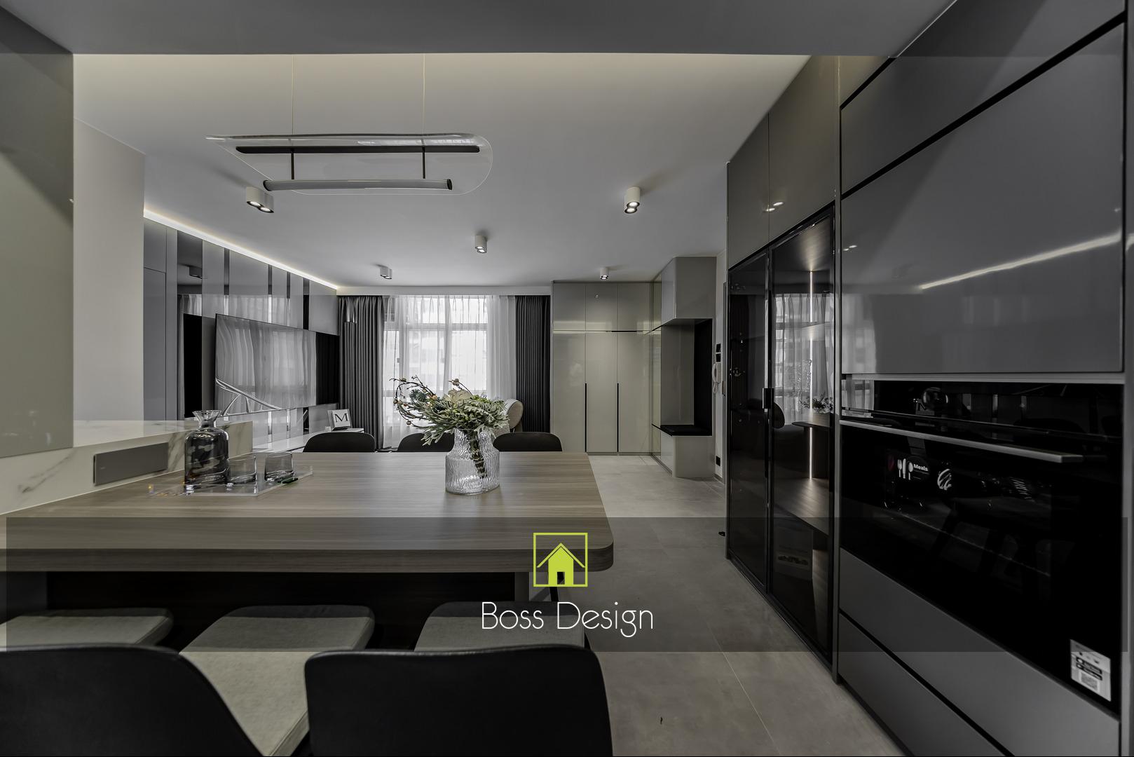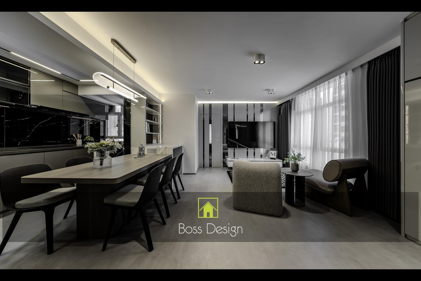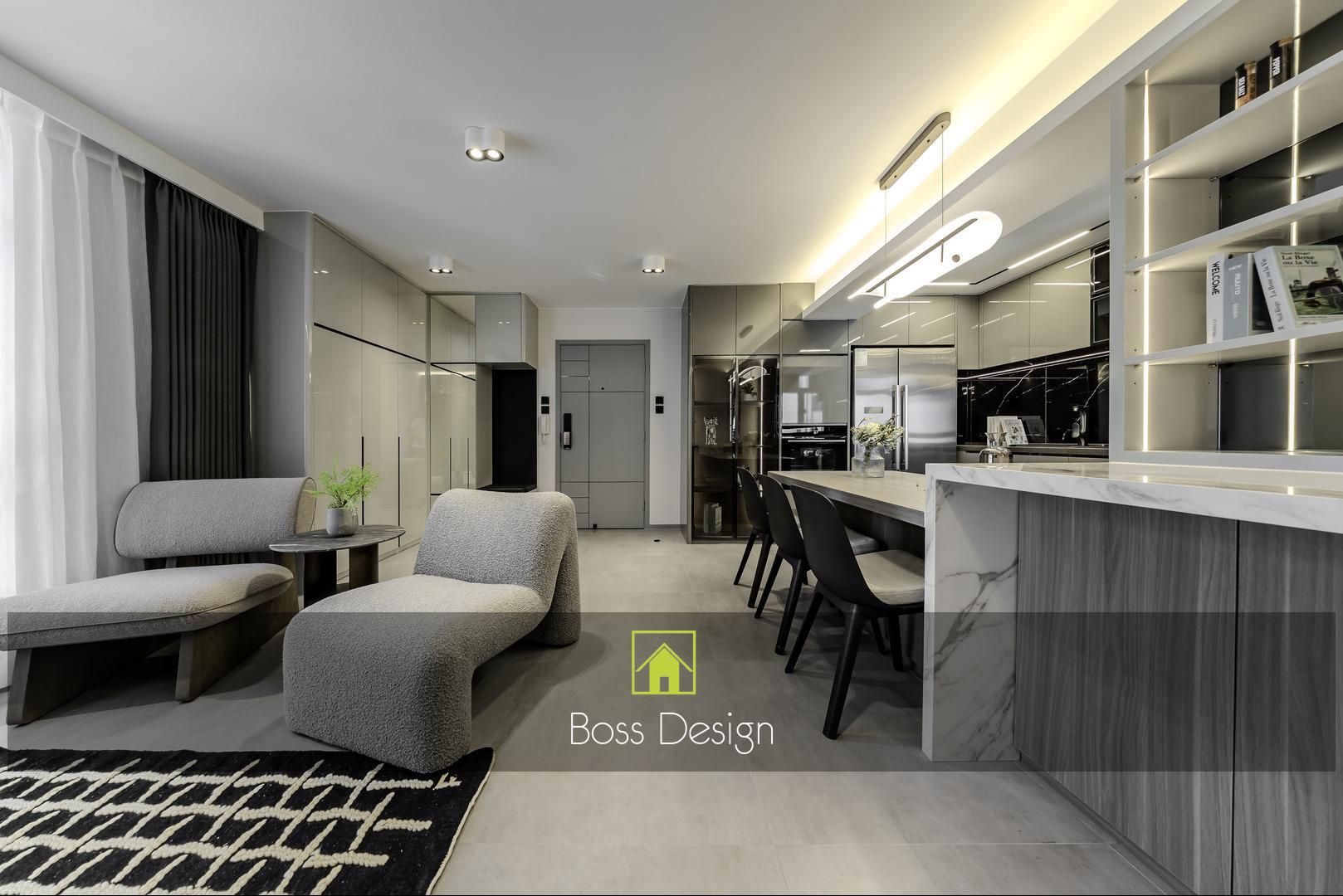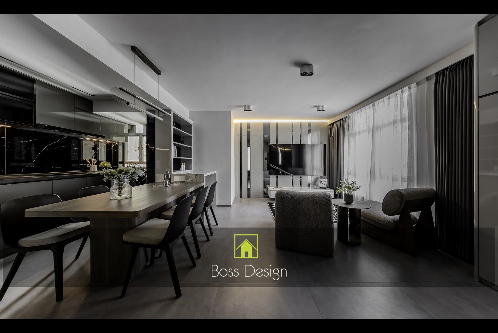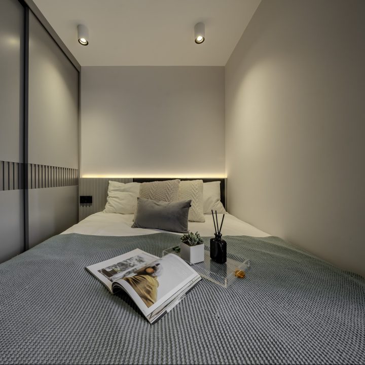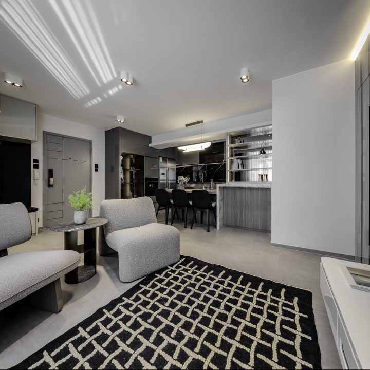 燈光設計上,我們採用3000K色溫,營造溫暖舒適的氛圍,並在天花均勻分布盒仔燈,打造出類似攝影棚的效果,既美觀又實用。整體設計雖然以灰色為主,但通過深淺變化和黑色點綴,呈現出自然和諧的效果,完美契合屋主年輕才俊的品味。這個空間不僅時尚簡約,更充滿現代感,為客戶一家三口提供了一個舒適而富有格調的家居環境。