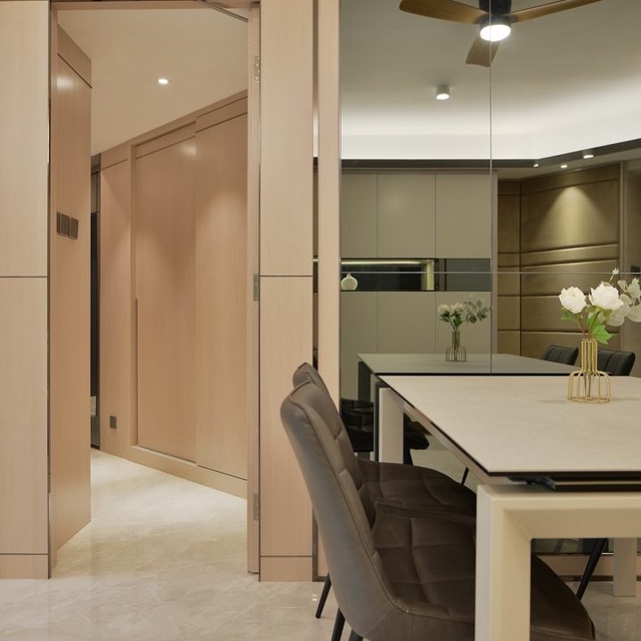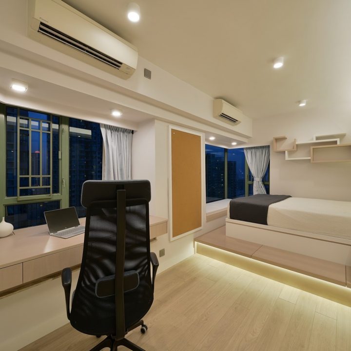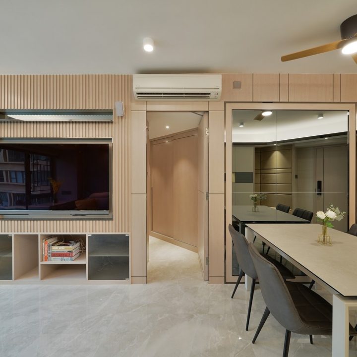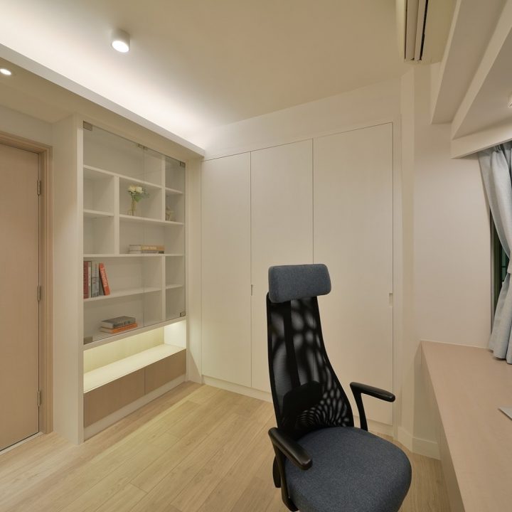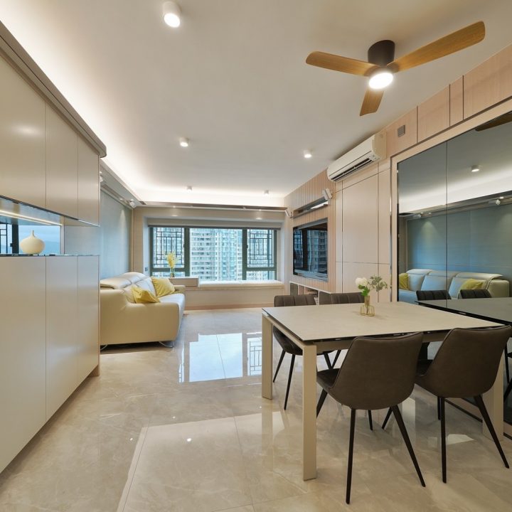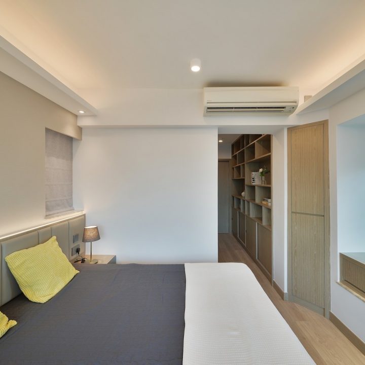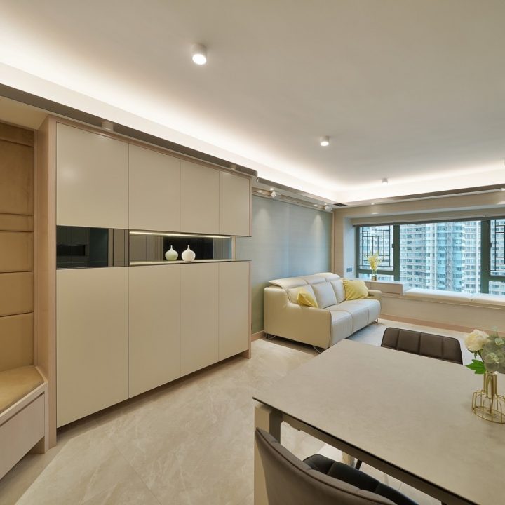 整體色系則以物品本身顏色為主,以白色、原木色、不銹鋼色為主,部分綠色植栽點綴。客廳本身以沙發搭配木格收納櫃為主,地面超耐磨木地板特意採用相同色系,臥室也是延續木元素的舒適簡約設計,流露日式禪意,平添輕柔細膩之感。