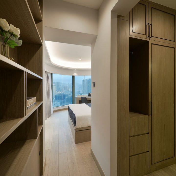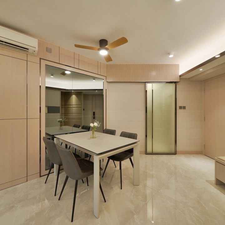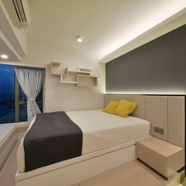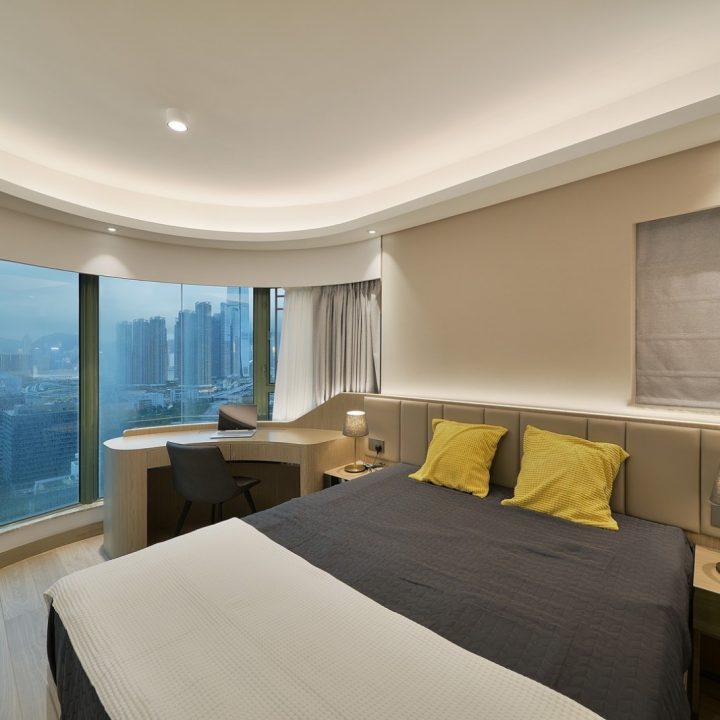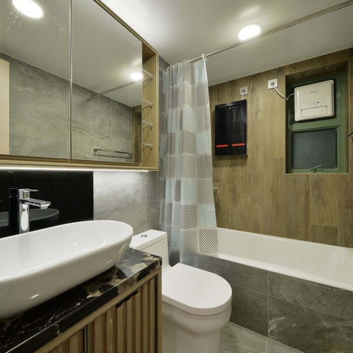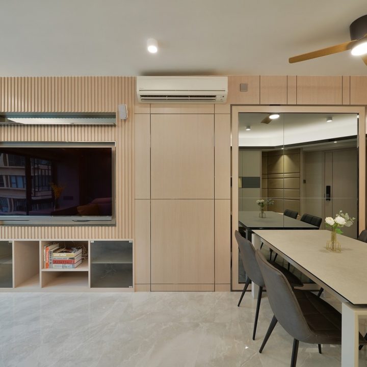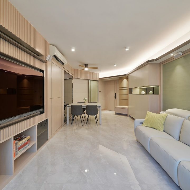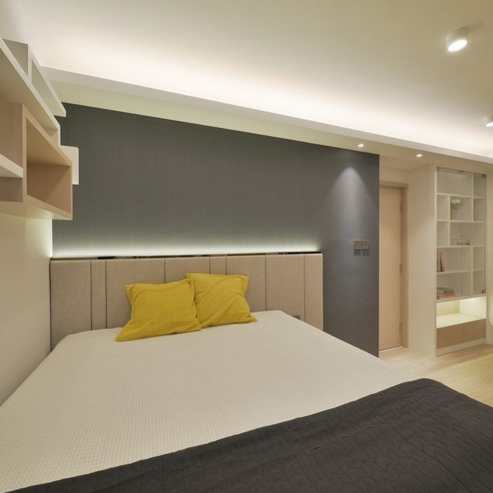 整體色系則以物品本身顏色為主,以白色、原木色、不銹鋼色為主,部分綠色植栽點綴。客廳本身以沙發搭配木格收納櫃為主,地面超耐磨木地板特意採用相同色系,臥室也是延續木元素的舒適簡約設計,流露日式禪意,平添輕柔細膩之感。
