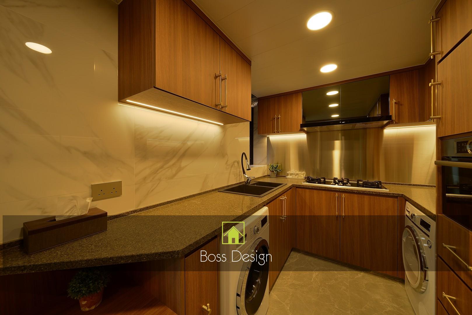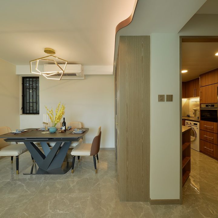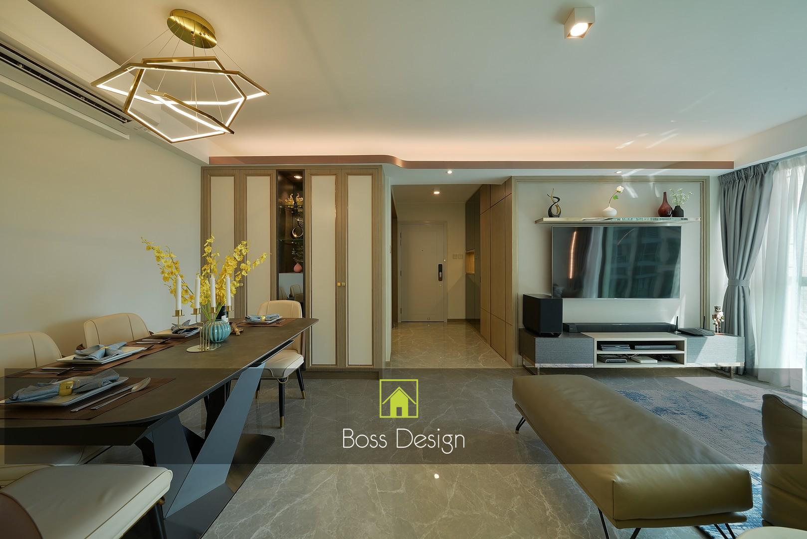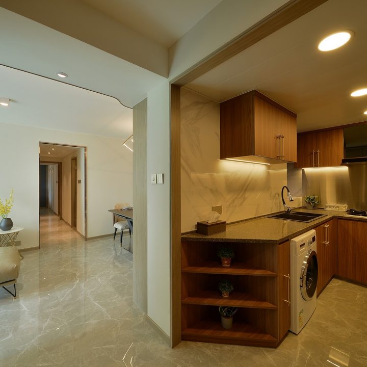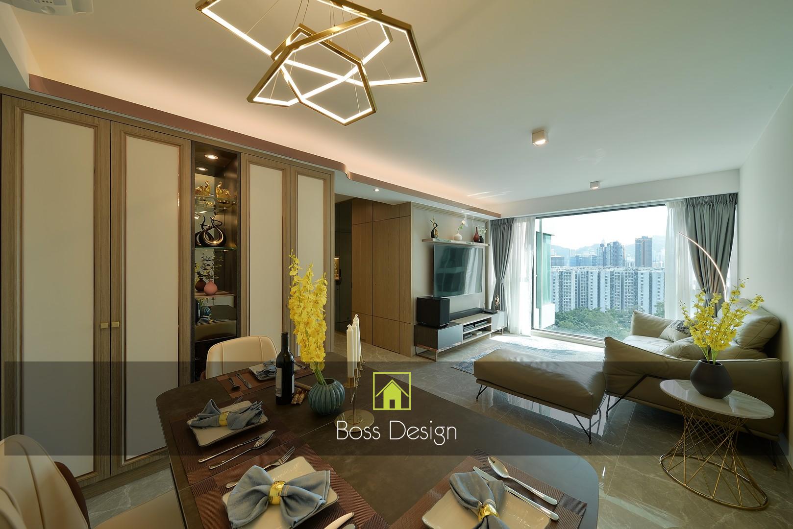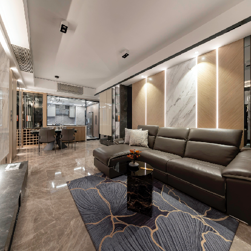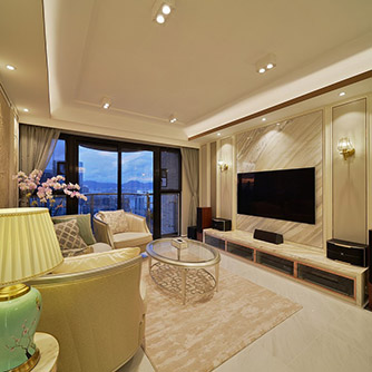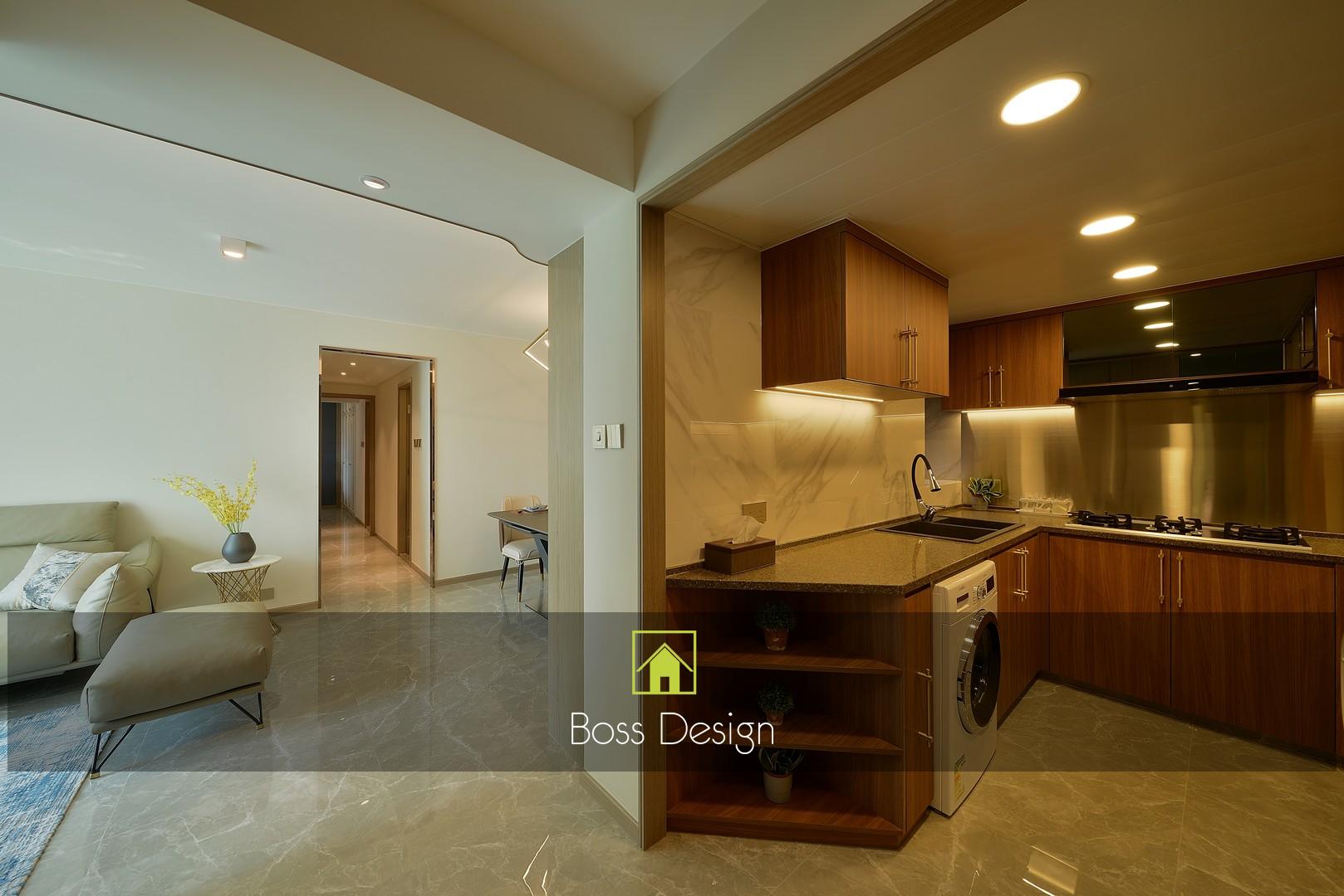 整個空間為現代簡約的設計,大面積的落地窗,為客廳提供了充足的採光,佈置現代簡約的沙發以及柔和燈光下的廚房,營造出了一個舒適明亮的空間氛圍。木質家居,再加以大理石地板,與電視櫃連成一體,營造出一種現代簡雅的高級設計感。