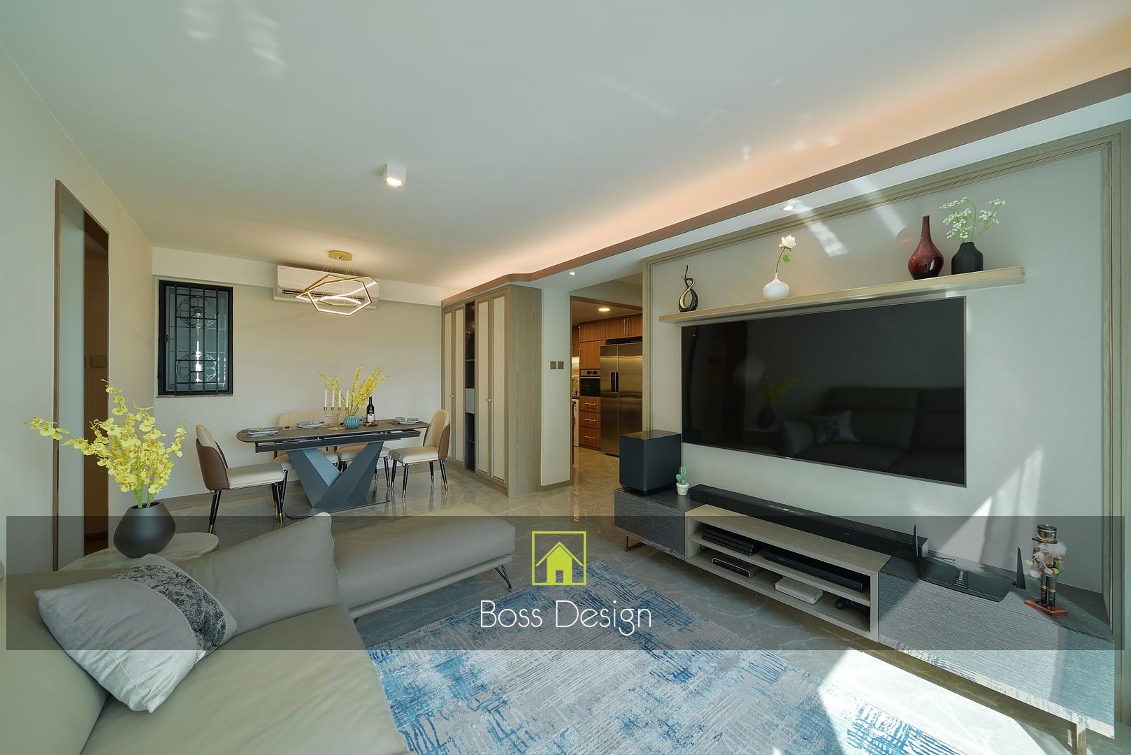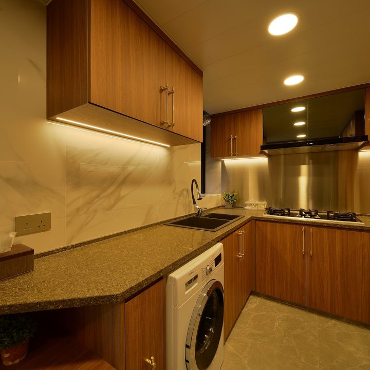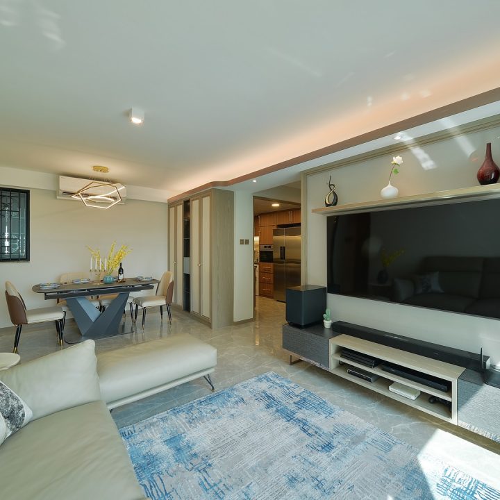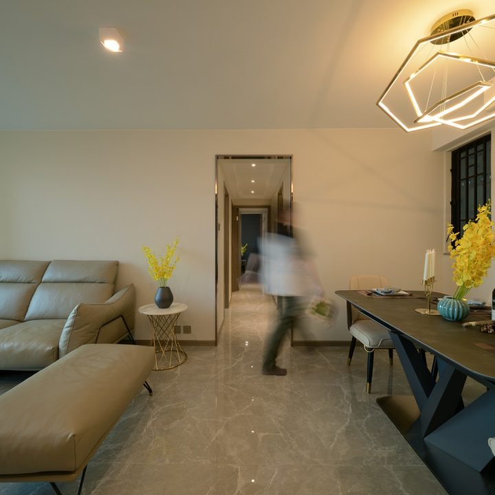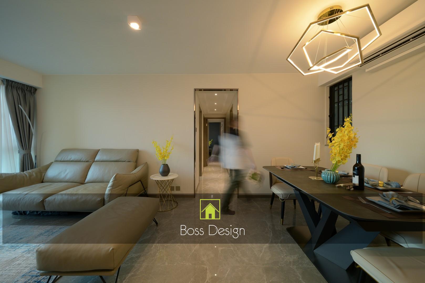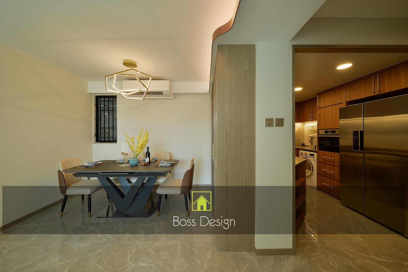 整個空間為現代簡約的設計,大面積的落地窗,為客廳提供了充足的採光,佈置現代簡約的沙發以及柔和燈光下的廚房,營造出了一個舒適明亮的空間氛圍。木質家居,再加以大理石地板,與電視櫃連成一體,營造出一種現代簡雅的高級設計感。