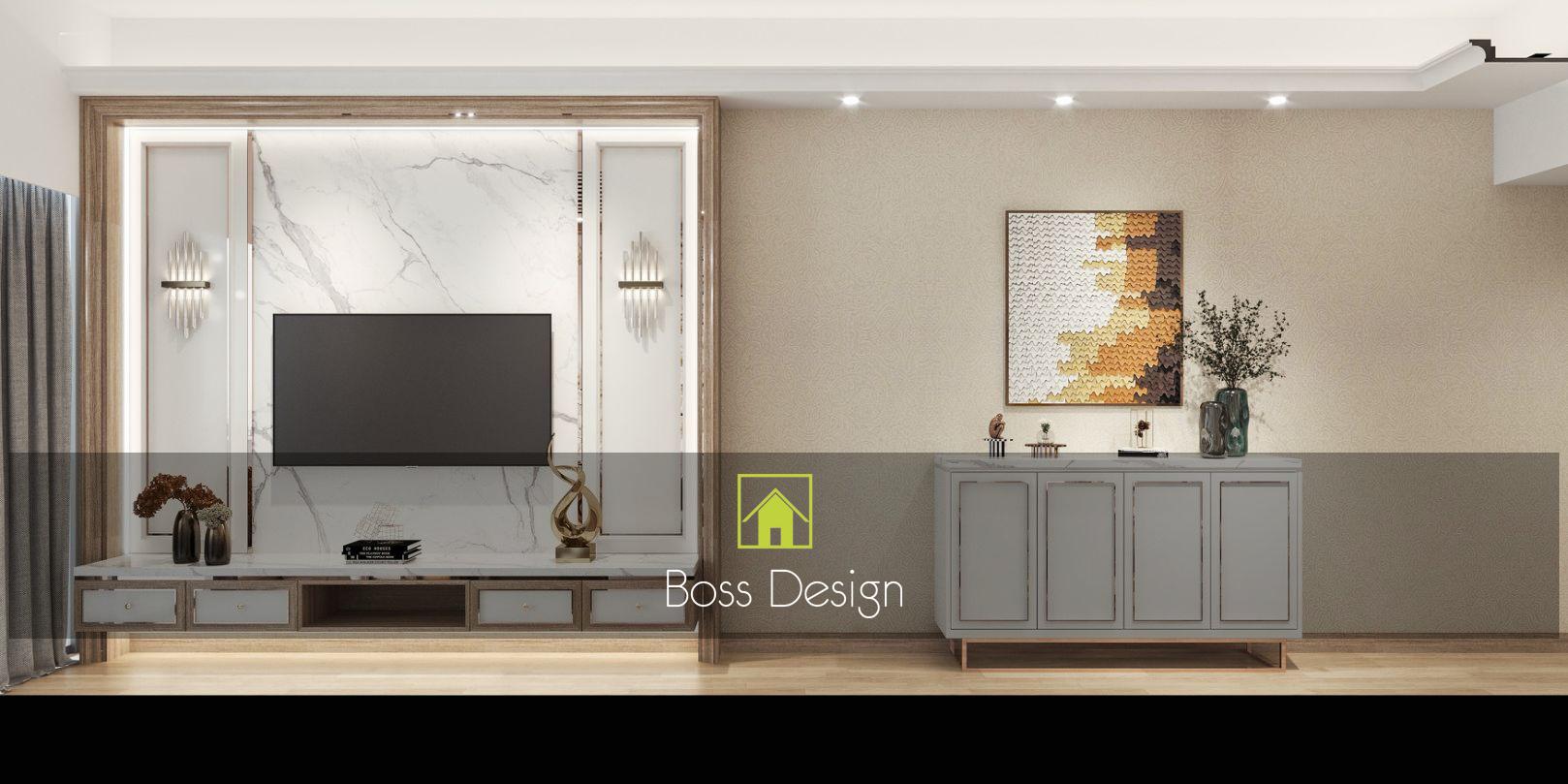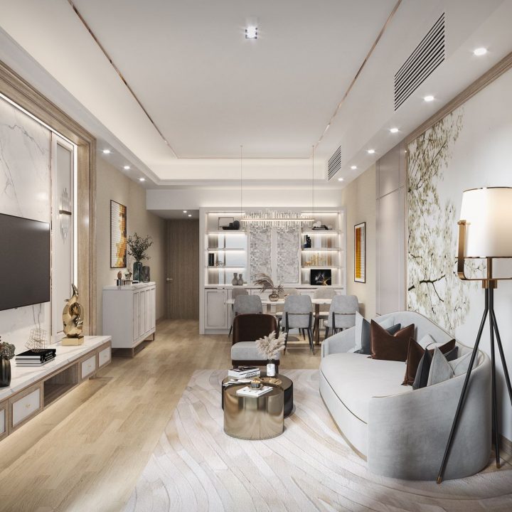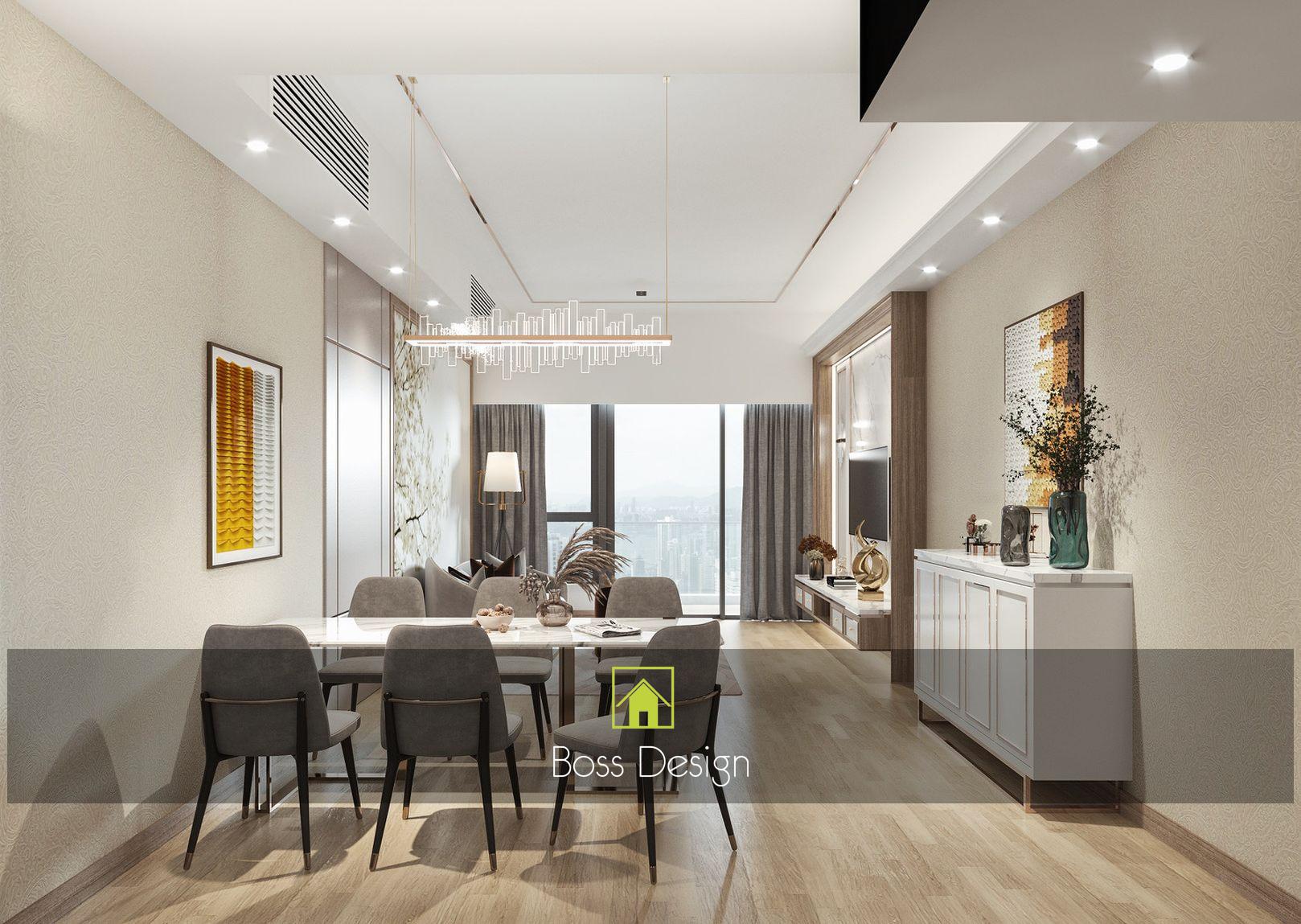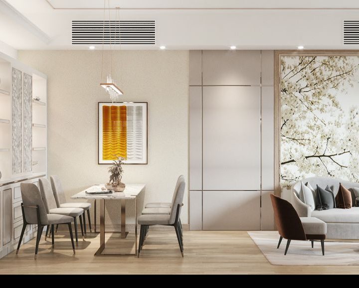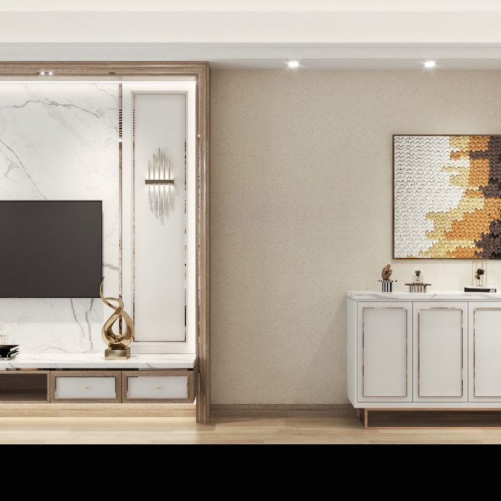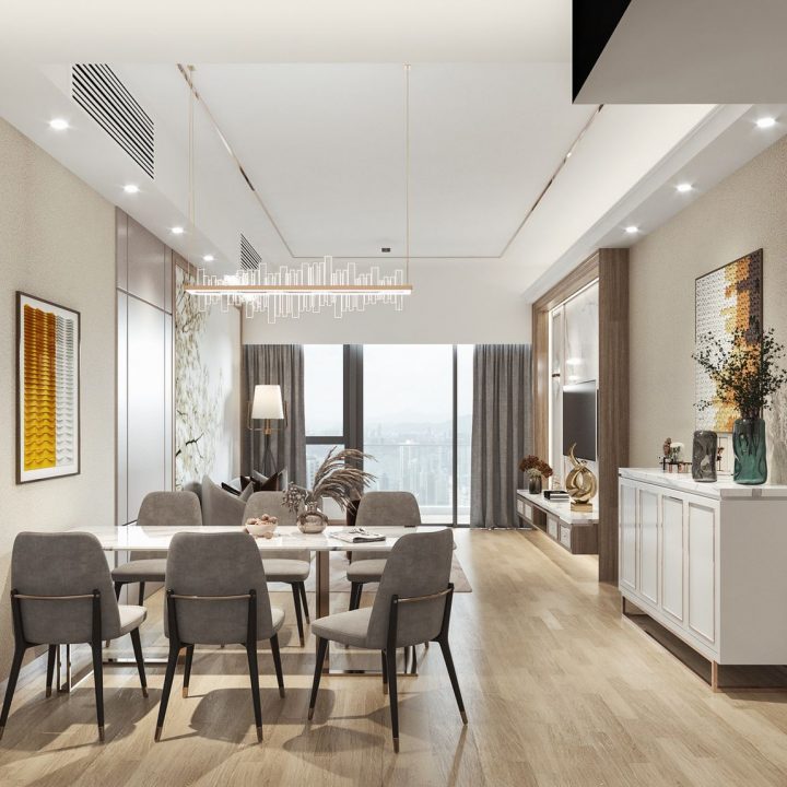 電視背景牆及側面收納櫃的設計,同樣採用純白色與大理石風景畫的結合,元素之間相呼應,讓空間極具現代風的時尚與高級感。餐廳以簡約優雅的設計,淺灰色為主調,打造整體空間的舒適氛圍,落地窗在最大程度上引光入室,帶來了自然與陽光的洗禮,讓整個空間浸染了藝術感。