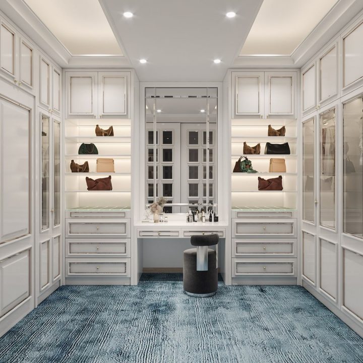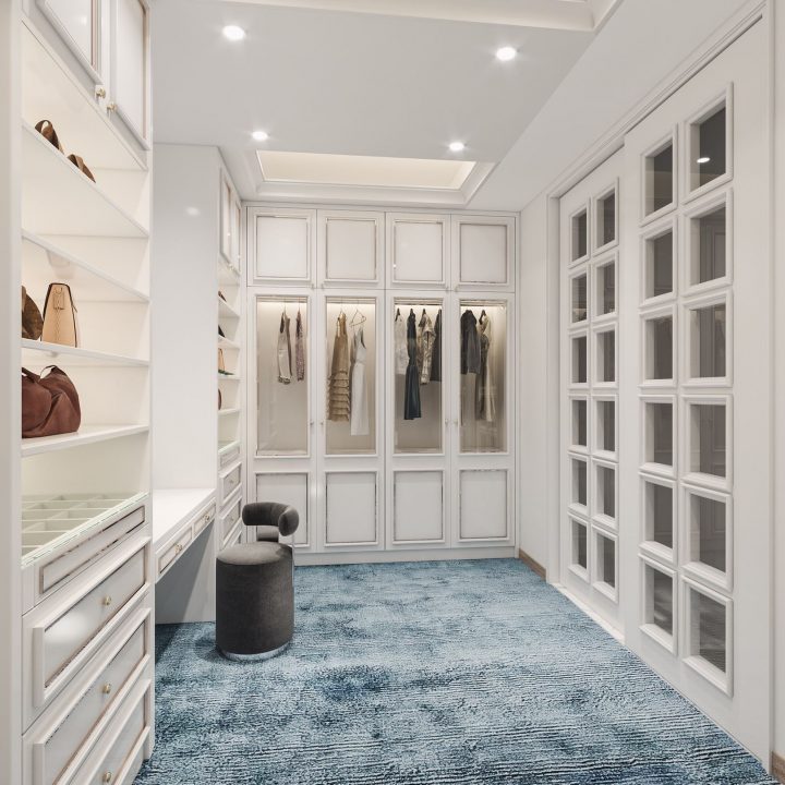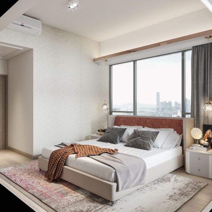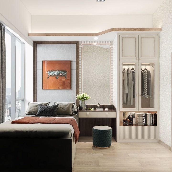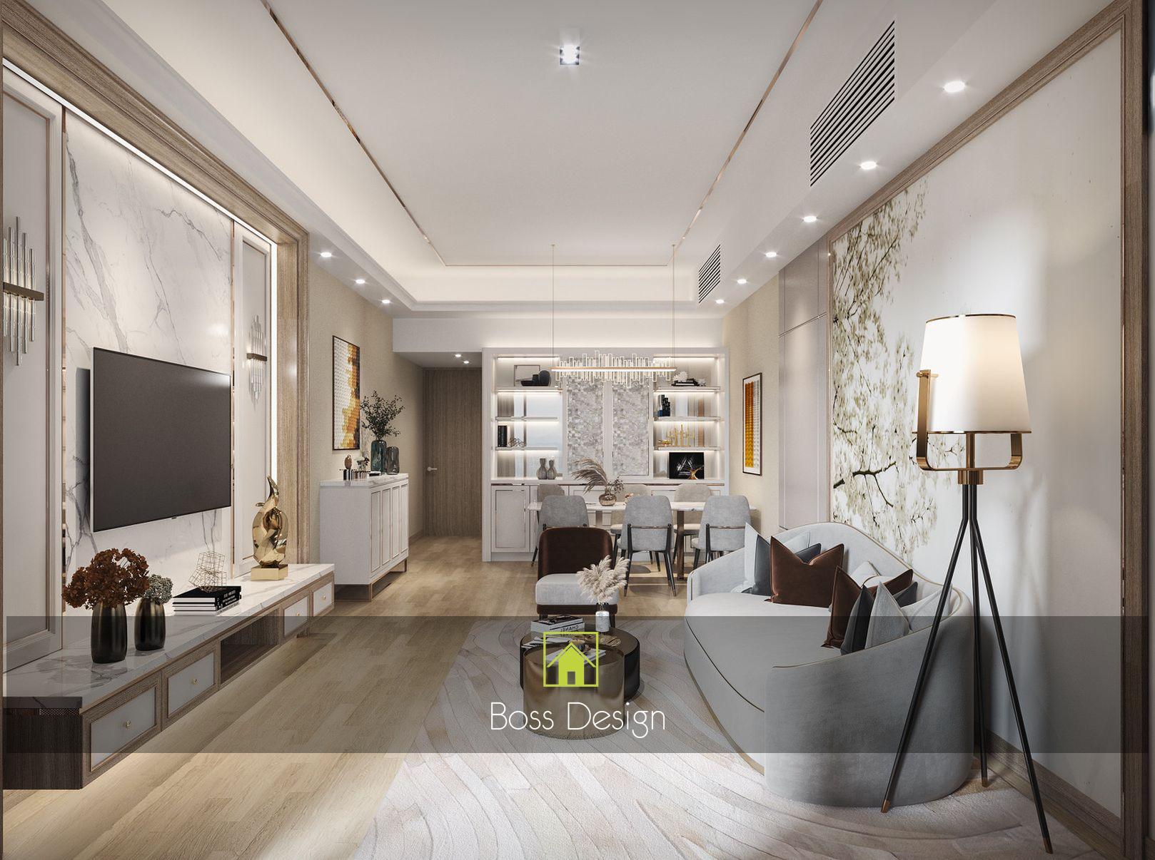 電視背景牆及側面收納櫃的設計,同樣採用純白色與大理石風景畫的結合,元素之間相呼應,讓空間極具現代風的時尚與高級感。餐廳以簡約優雅的設計,淺灰色為主調,打造整體空間的舒適氛圍,落地窗在最大程度上引光入室,帶來了自然與陽光的洗禮,讓整個空間浸染了藝術感。