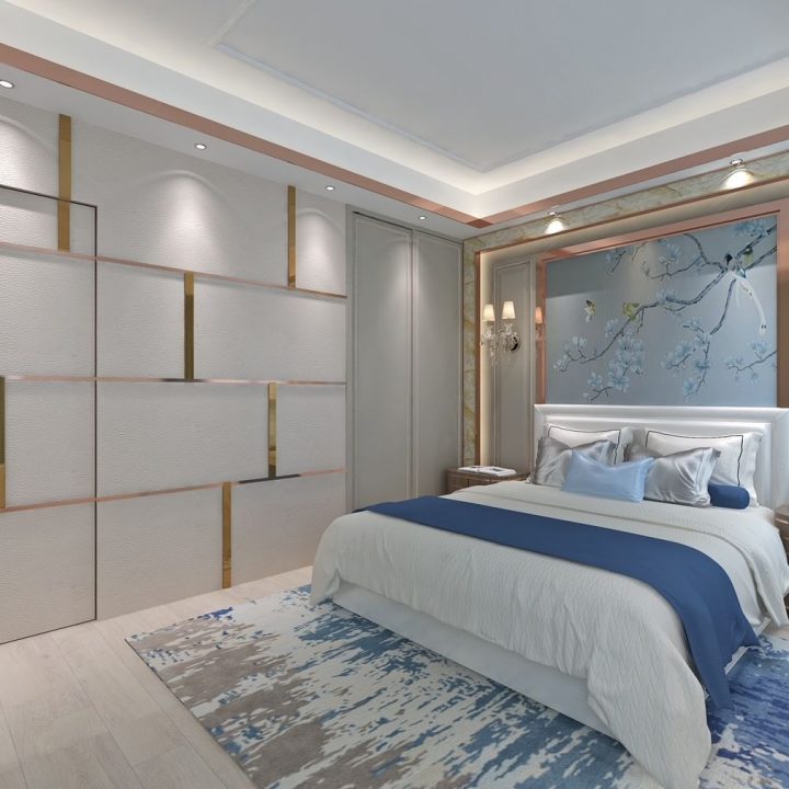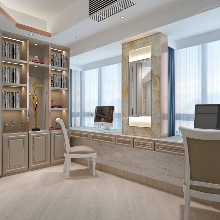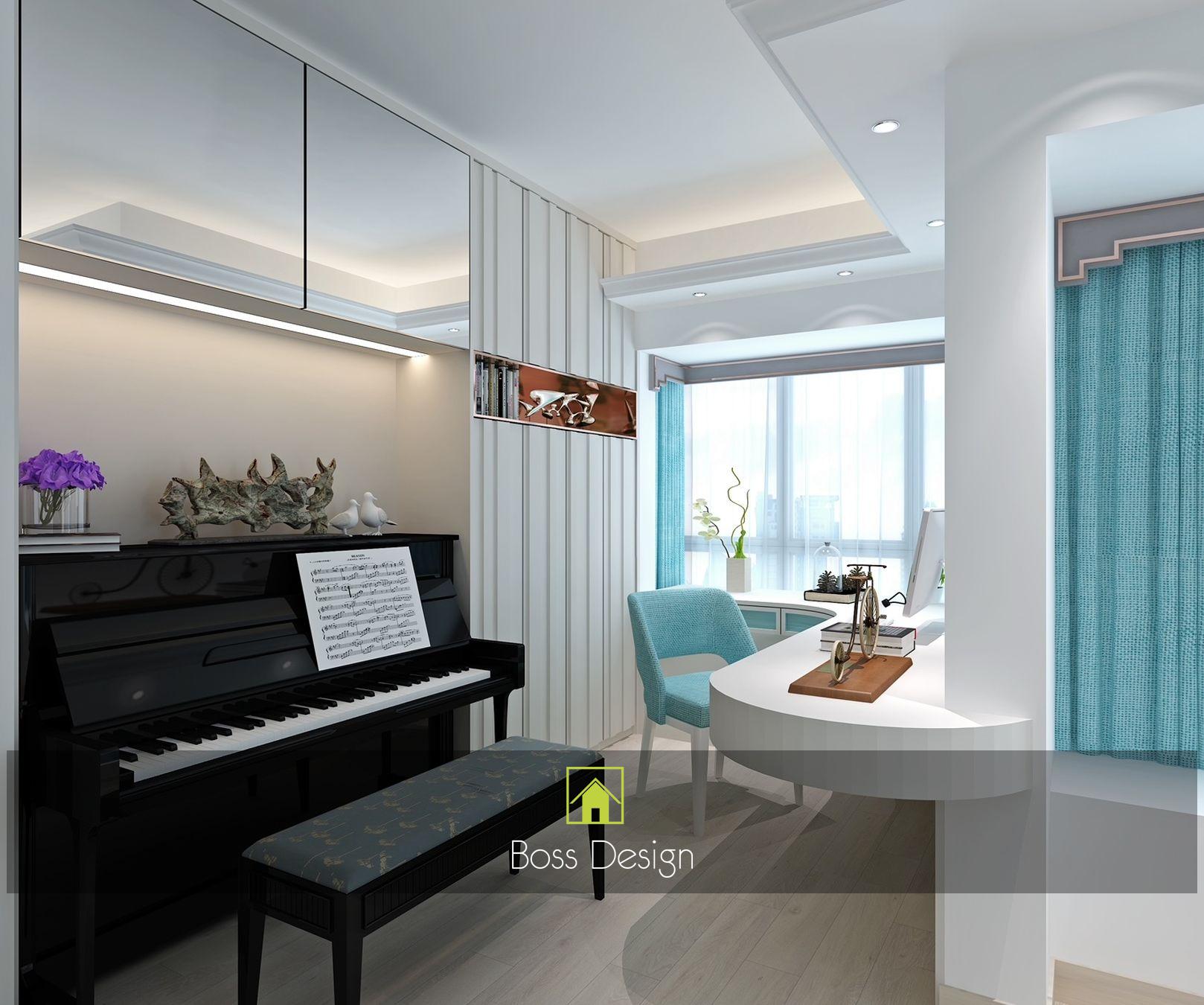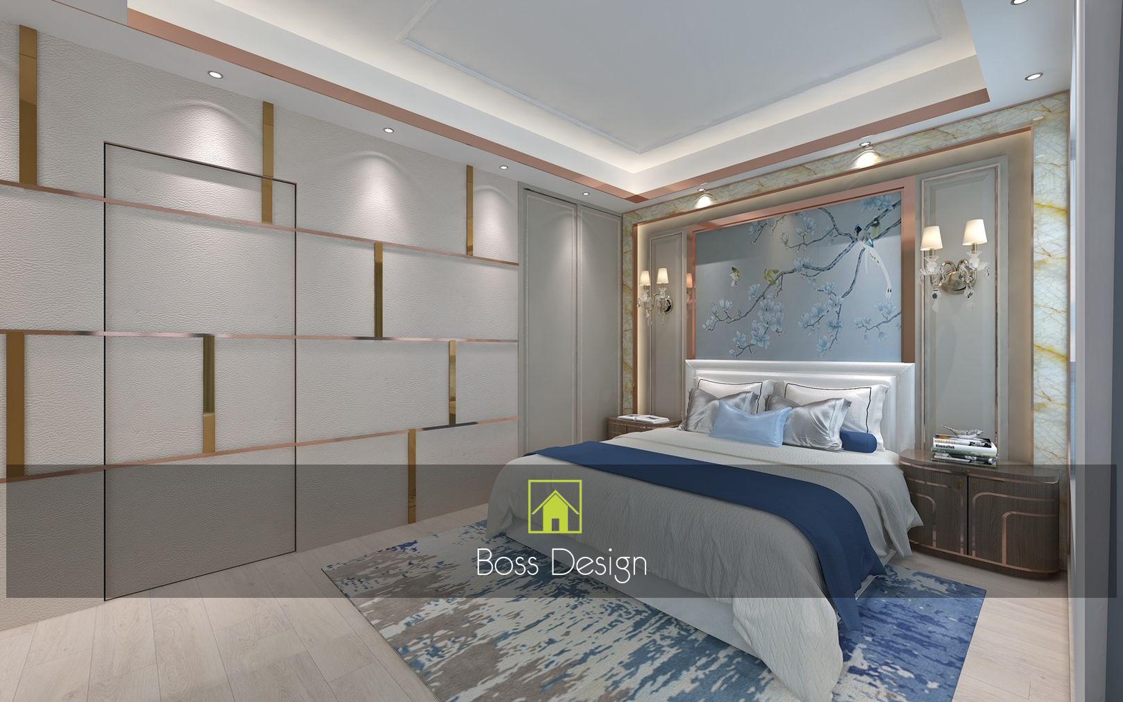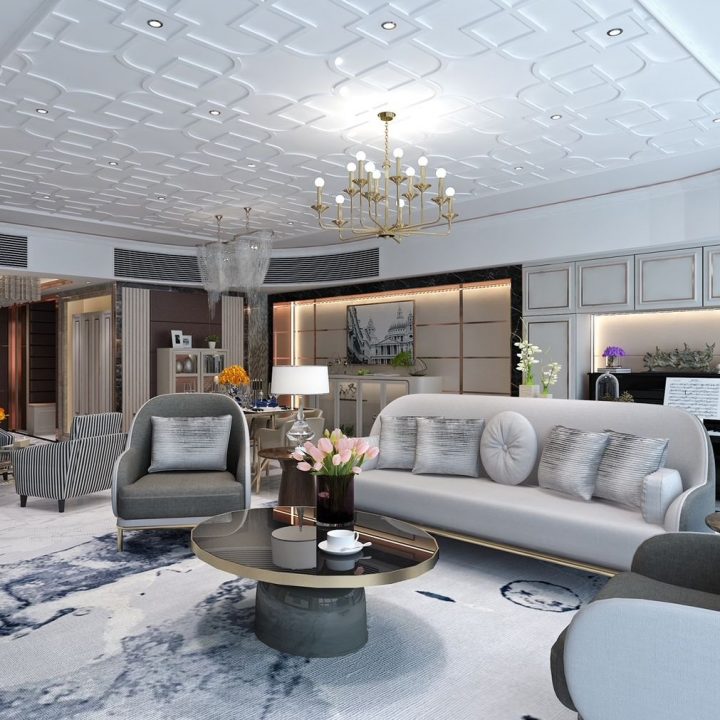 現代風的客廳空間,整體電視背景牆同色木飾面+櫃子的設計,大理石的加入,形成材質的反差,讓整體空間和諧而大方整體色調以灰白色調為主,在灰色調中尋找一些跳脫的色彩,營造了更獨特更精彩的高級空間,獨特的金屬檯面茶几搭配淺色的沙發,藍色水墨的地毯在明亮舒適的自然採光下,營造出一種現代舒適的優雅氛圍。