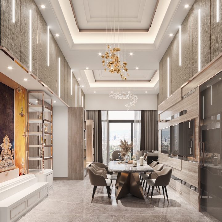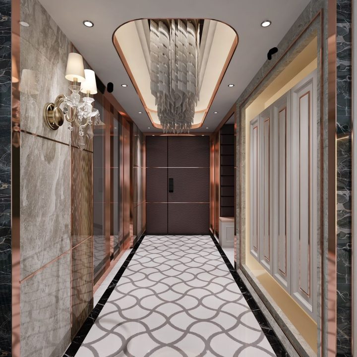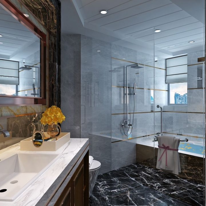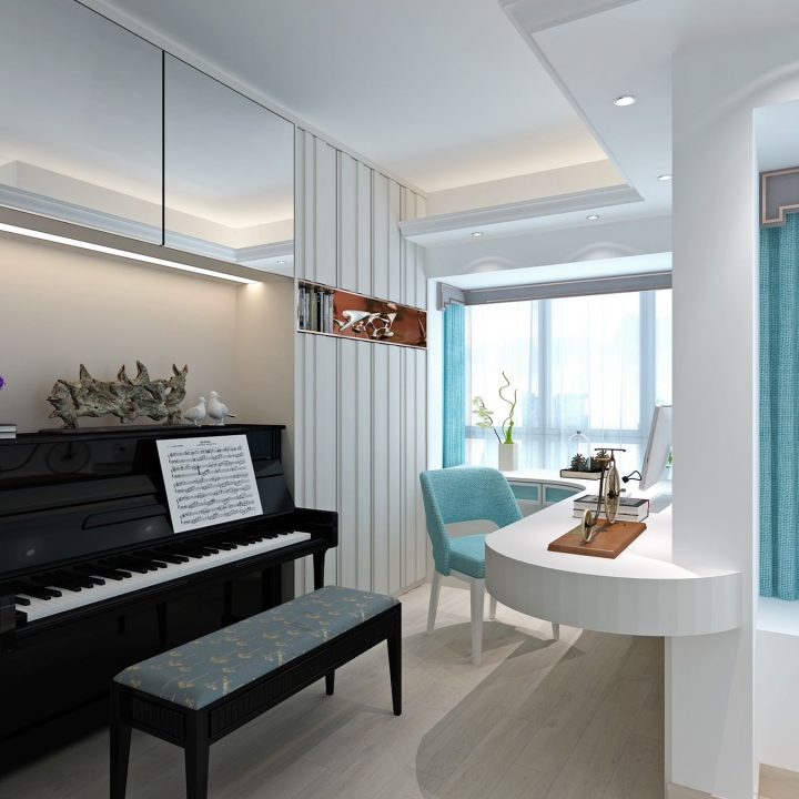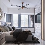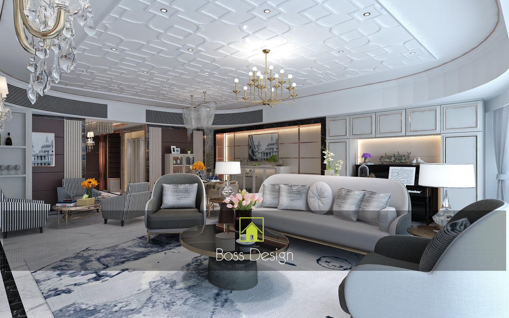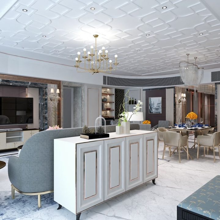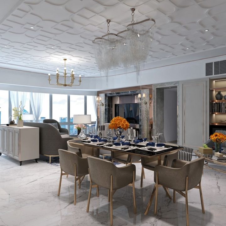 現代風的客廳空間,整體電視背景牆同色木飾面+櫃子的設計,大理石的加入,形成材質的反差,讓整體空間和諧而大方整體色調以灰白色調為主,在灰色調中尋找一些跳脫的色彩,營造了更獨特更精彩的高級空間,獨特的金屬檯面茶几搭配淺色的沙發,藍色水墨的地毯在明亮舒適的自然採光下,營造出一種現代舒適的優雅氛圍。