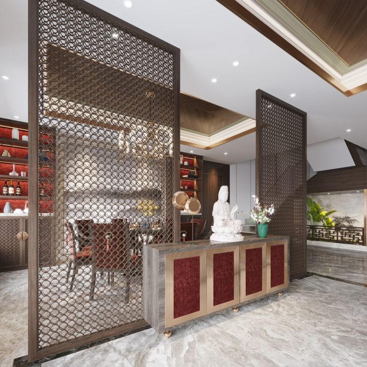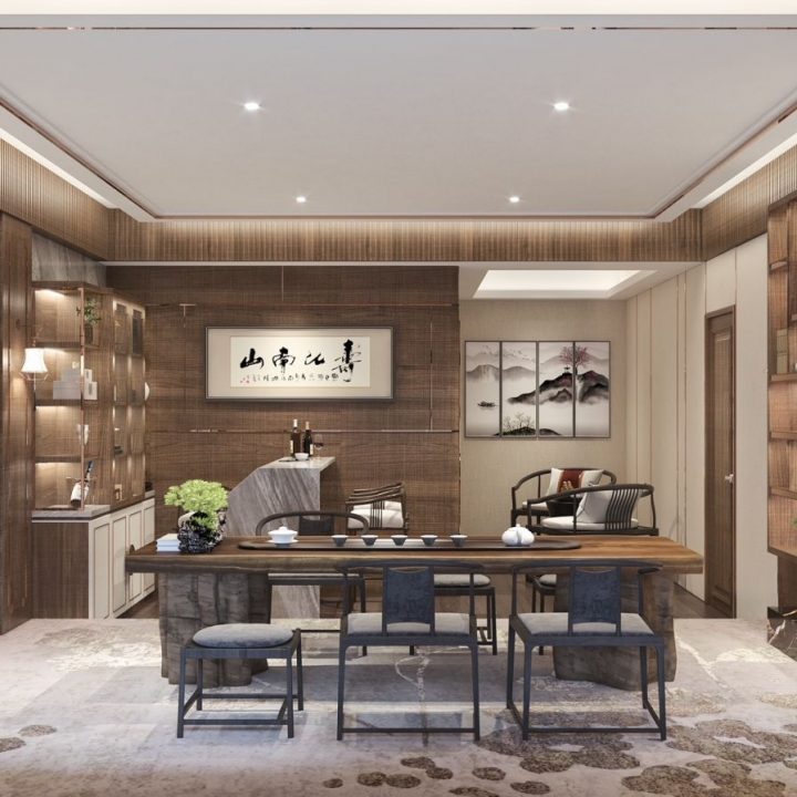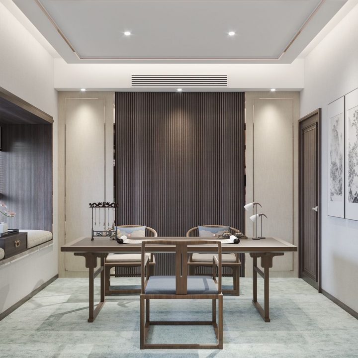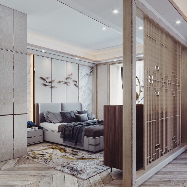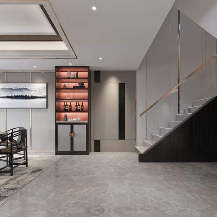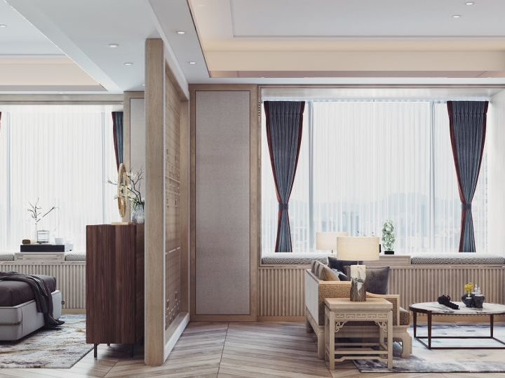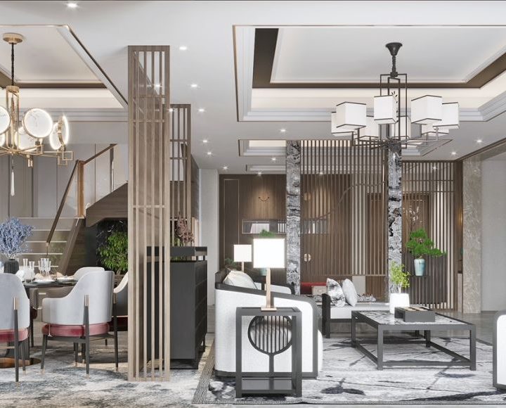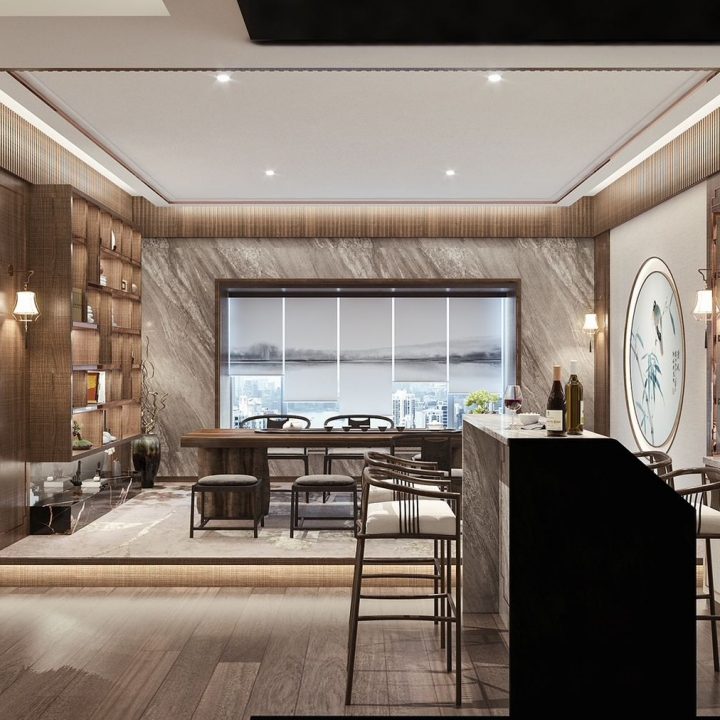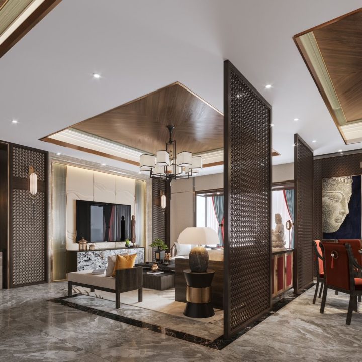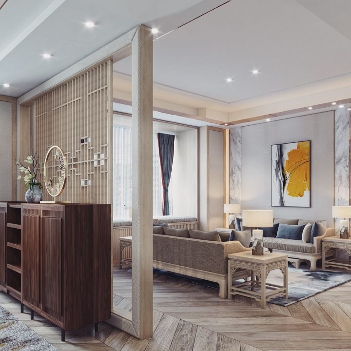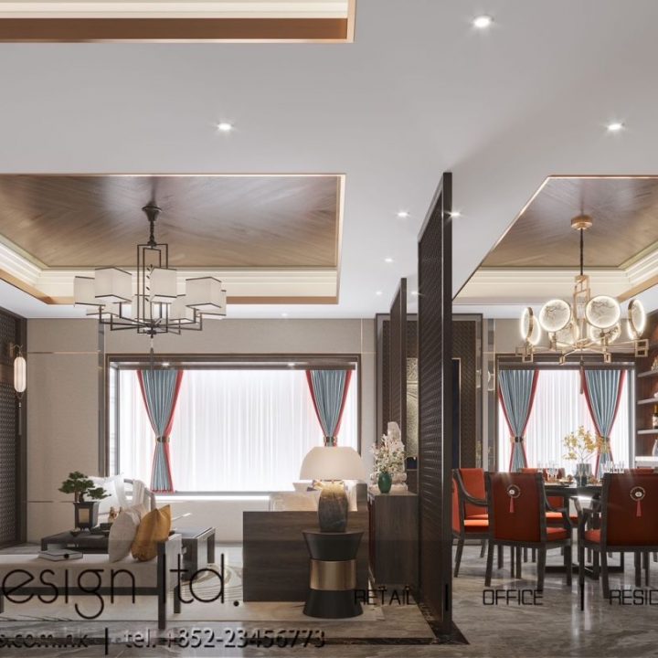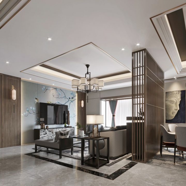 住宅空間大氣之中透露著簡約優雅。裝修選用頗具質感的瑰麗板+古香古色的中式家具,空間質樸端莊,低調奢華,美在神韻與內涵。牆面的木質輪廓與白色空間的反差,強調了結構與空間的立體感。不僅舒適,而且優雅,精美的隔斷與中式吊燈,都令整個空間不落俗套。