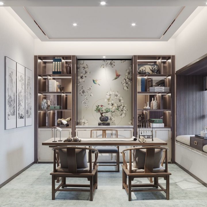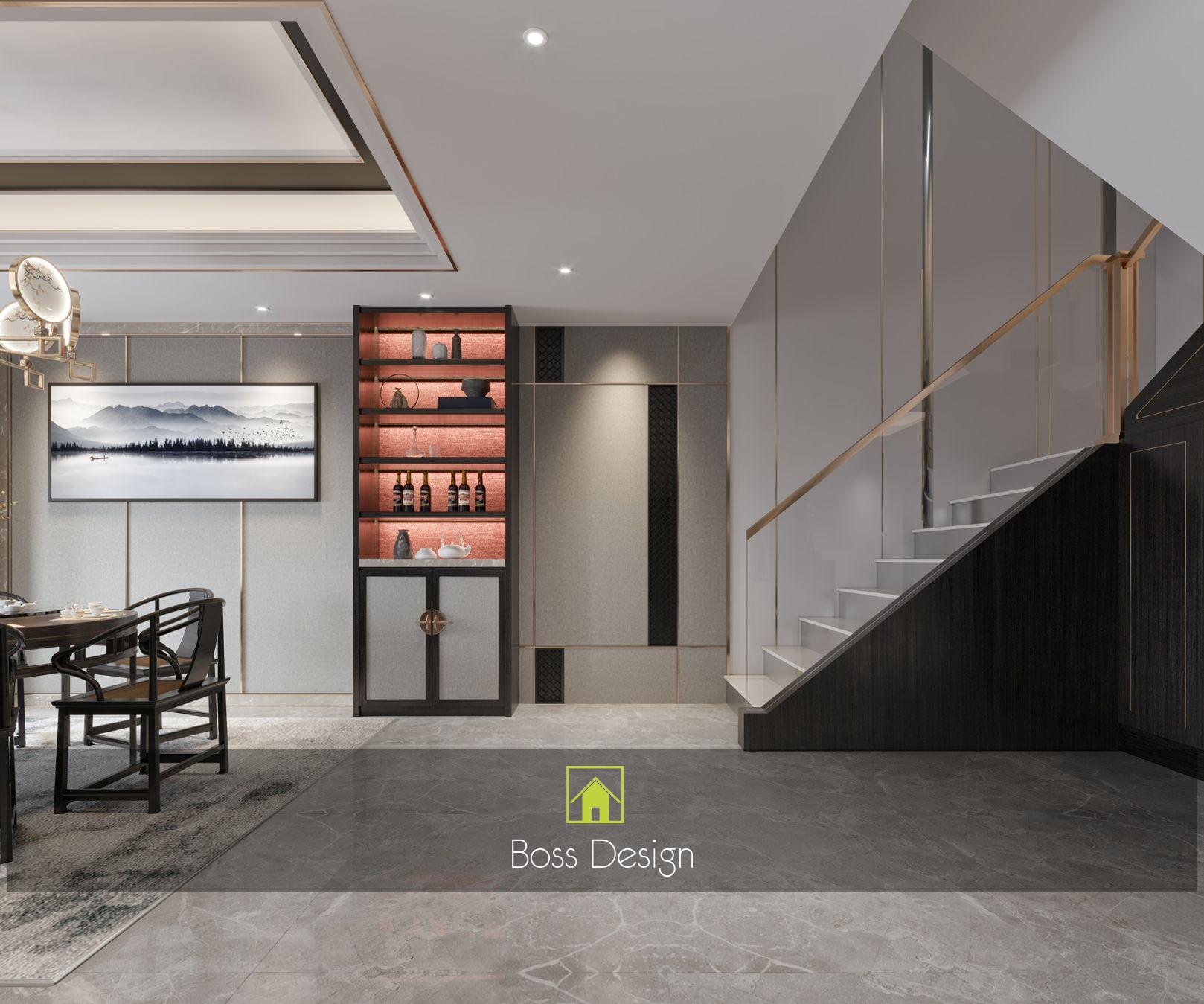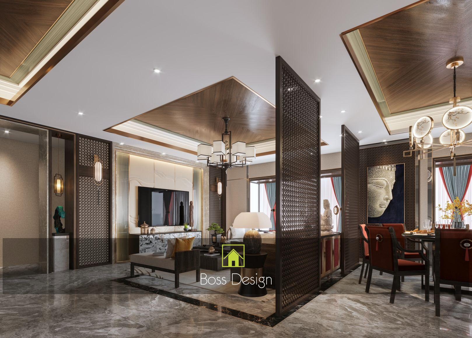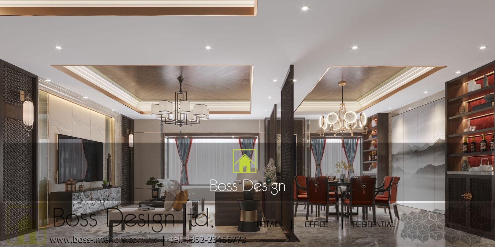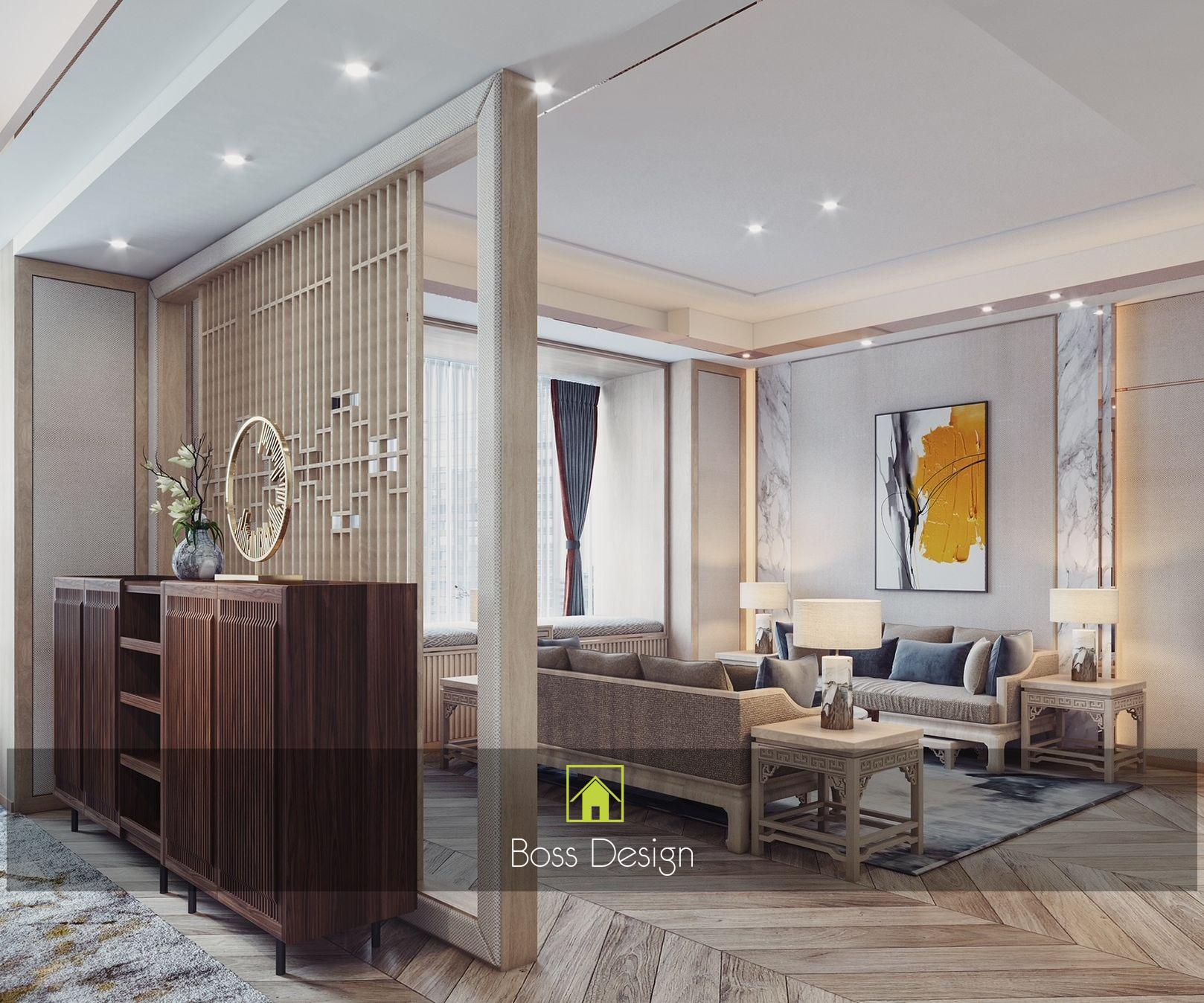 住宅空間大氣之中透露著簡約優雅。裝修選用頗具質感的瑰麗板+古香古色的中式家具,空間質樸端莊,低調奢華,美在神韻與內涵。牆面的木質輪廓與白色空間的反差,強調了結構與空間的立體感。不僅舒適,而且優雅,精美的隔斷與中式吊燈,都令整個空間不落俗套。