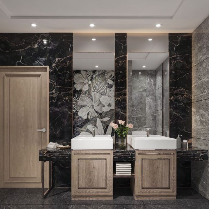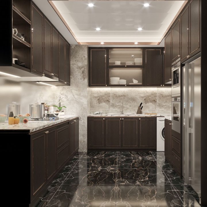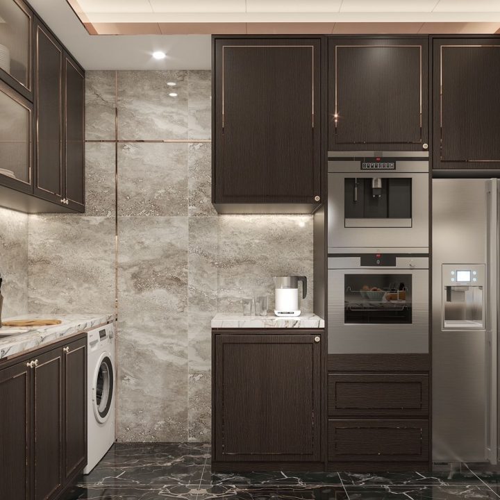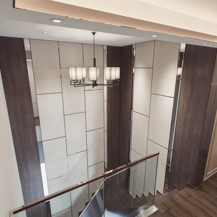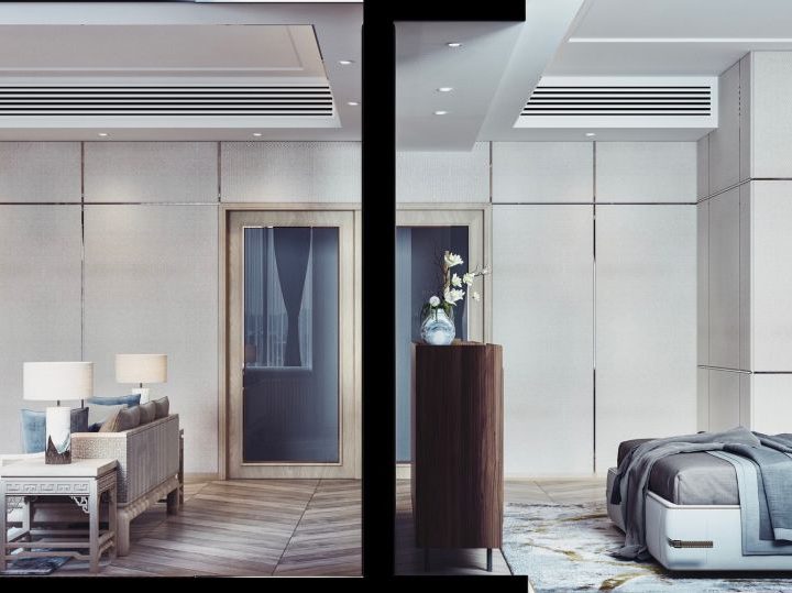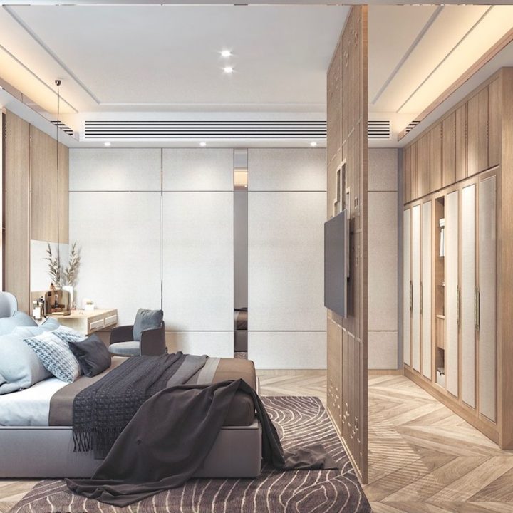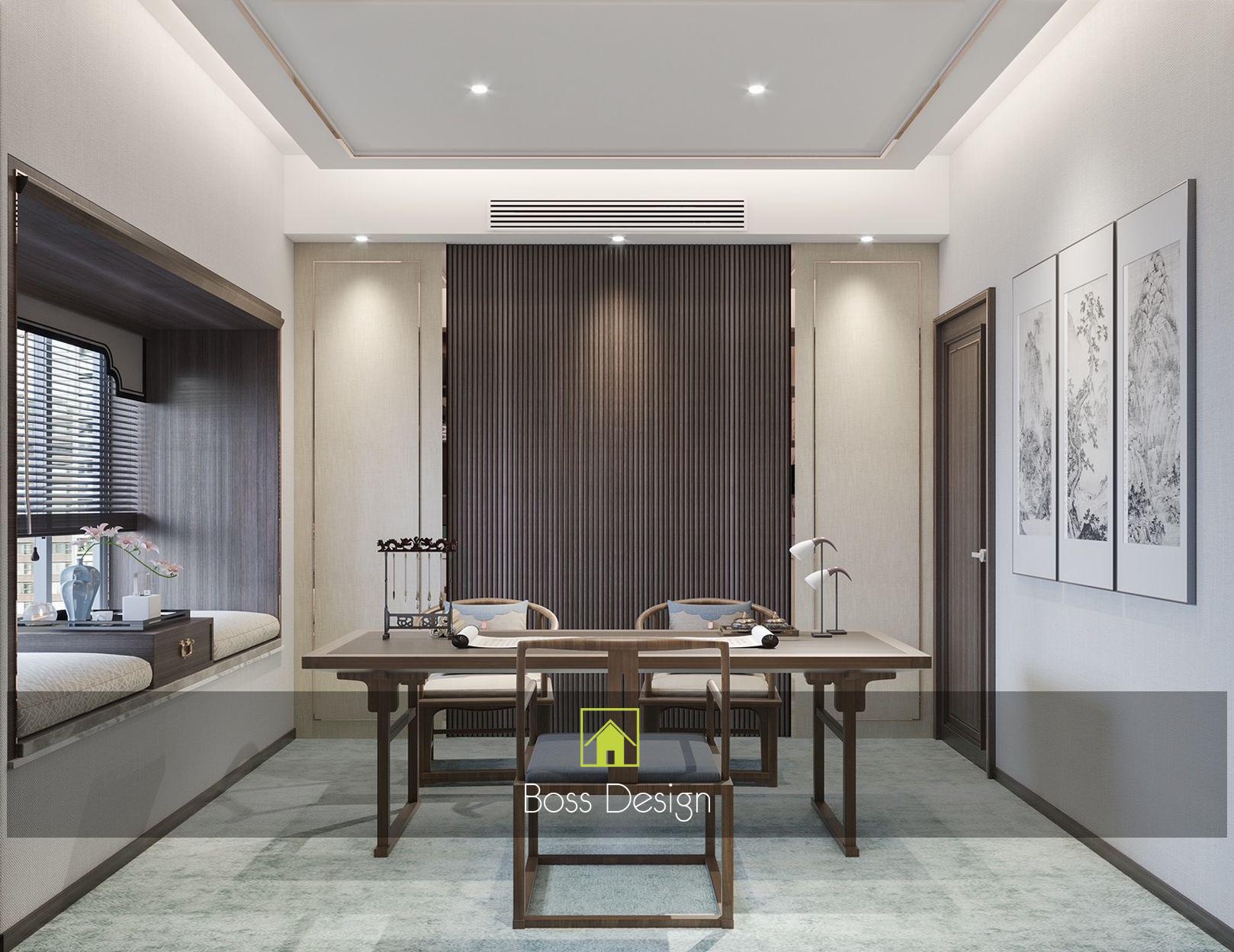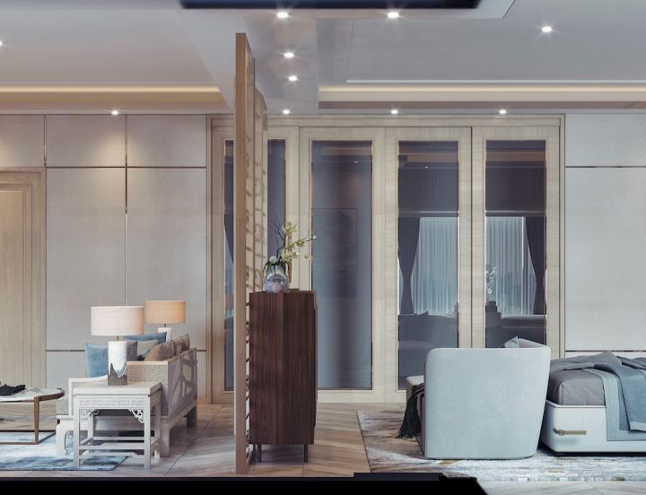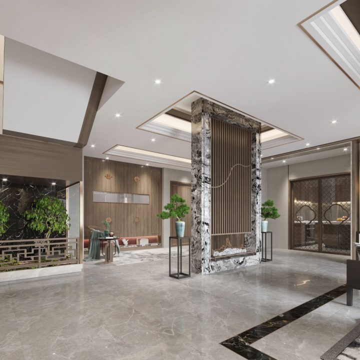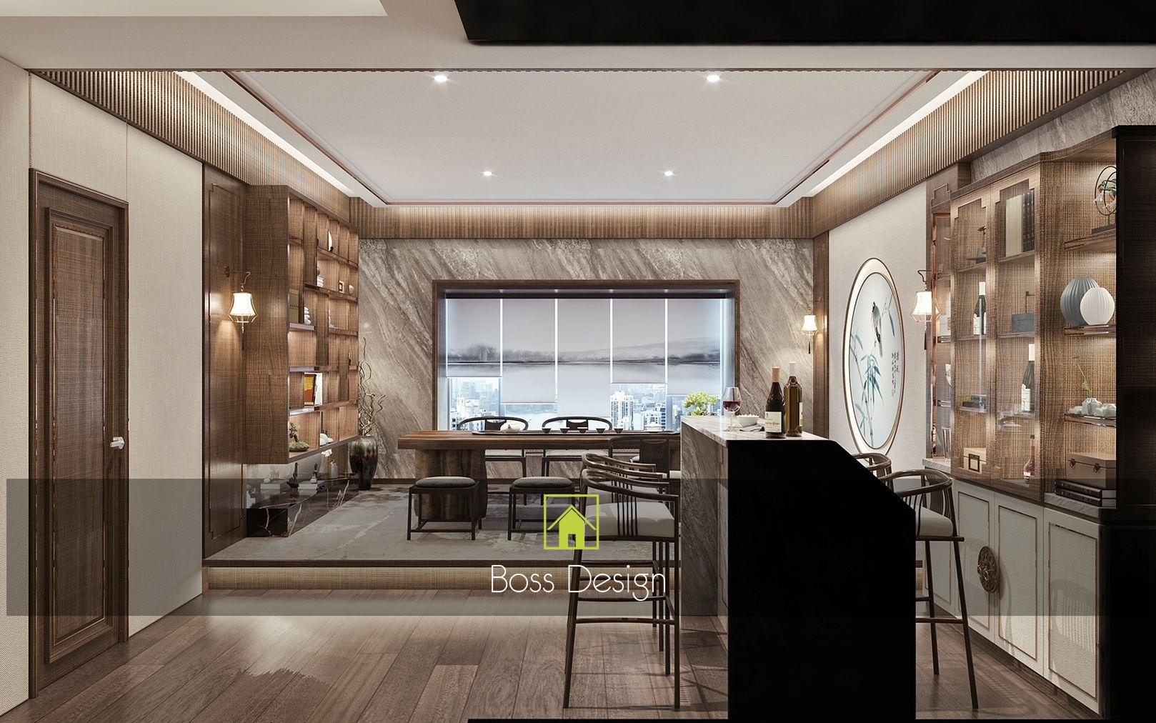 住宅空間大氣之中透露著簡約優雅。裝修選用頗具質感的瑰麗板+古香古色的中式家具,空間質樸端莊,低調奢華,美在神韻與內涵。牆面的木質輪廓與白色空間的反差,強調了結構與空間的立體感。不僅舒適,而且優雅,精美的隔斷與中式吊燈,都令整個空間不落俗套。